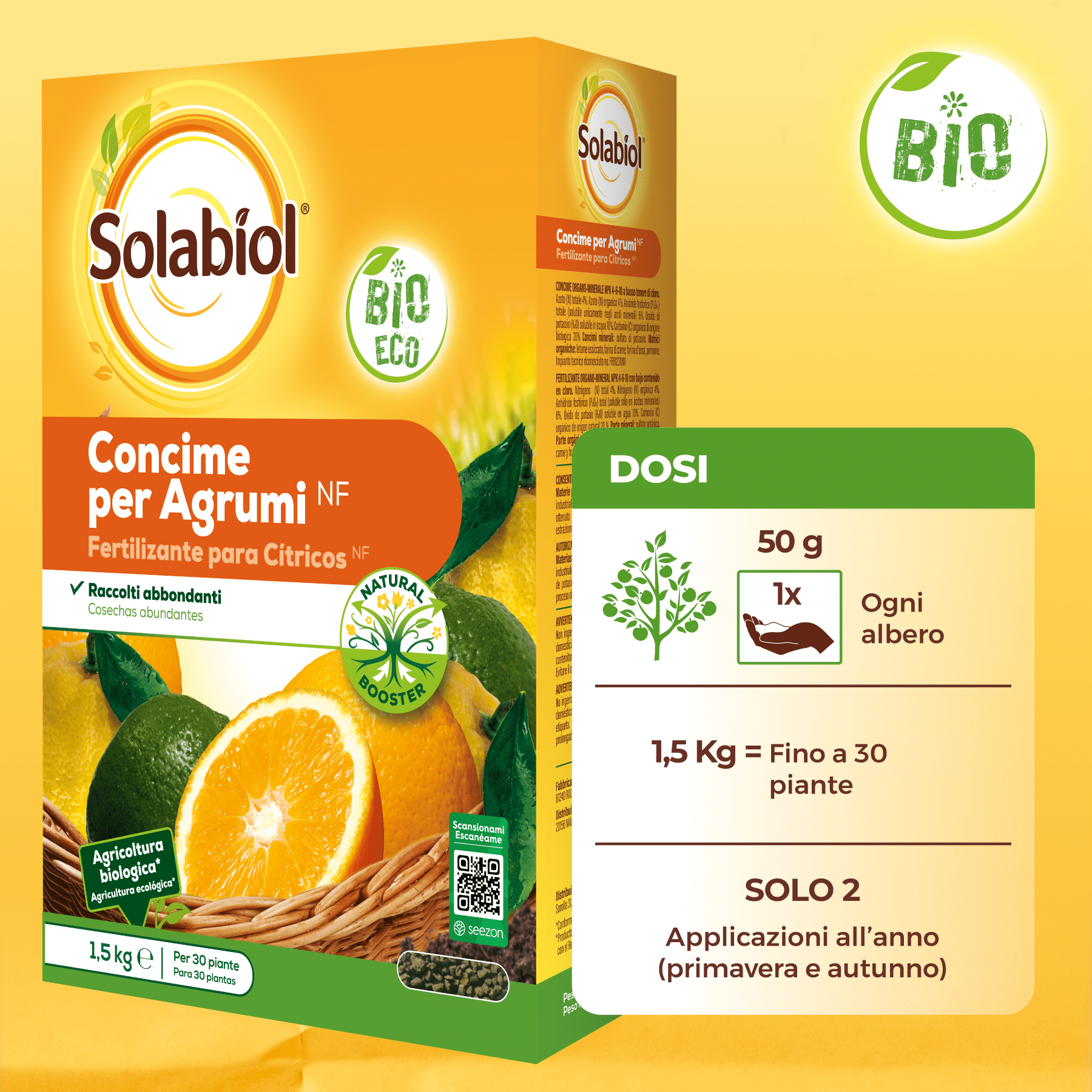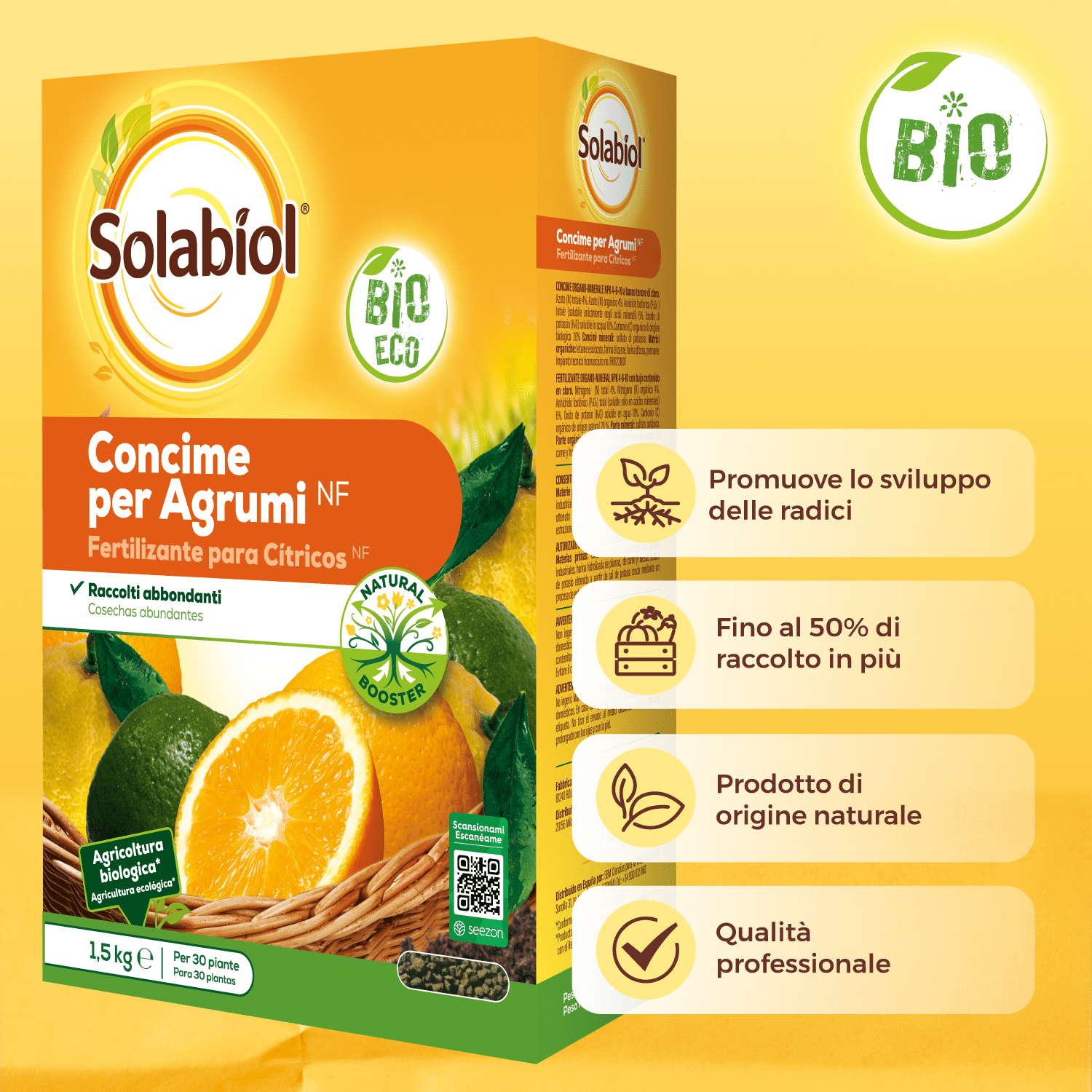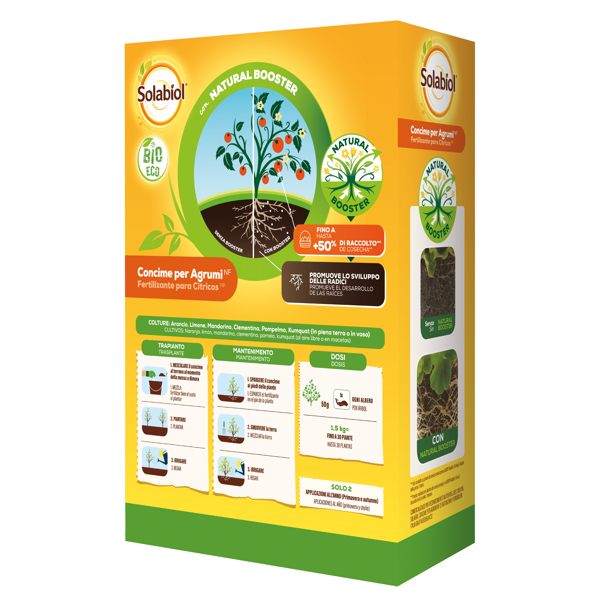 Solabiol Agrumi è un concime granulare 100% naturale con l’esclusiva tecnologia Natural Booster. Stimola lo sviluppo dell’apparato radicale, favorendo piante sane e rigogliose.