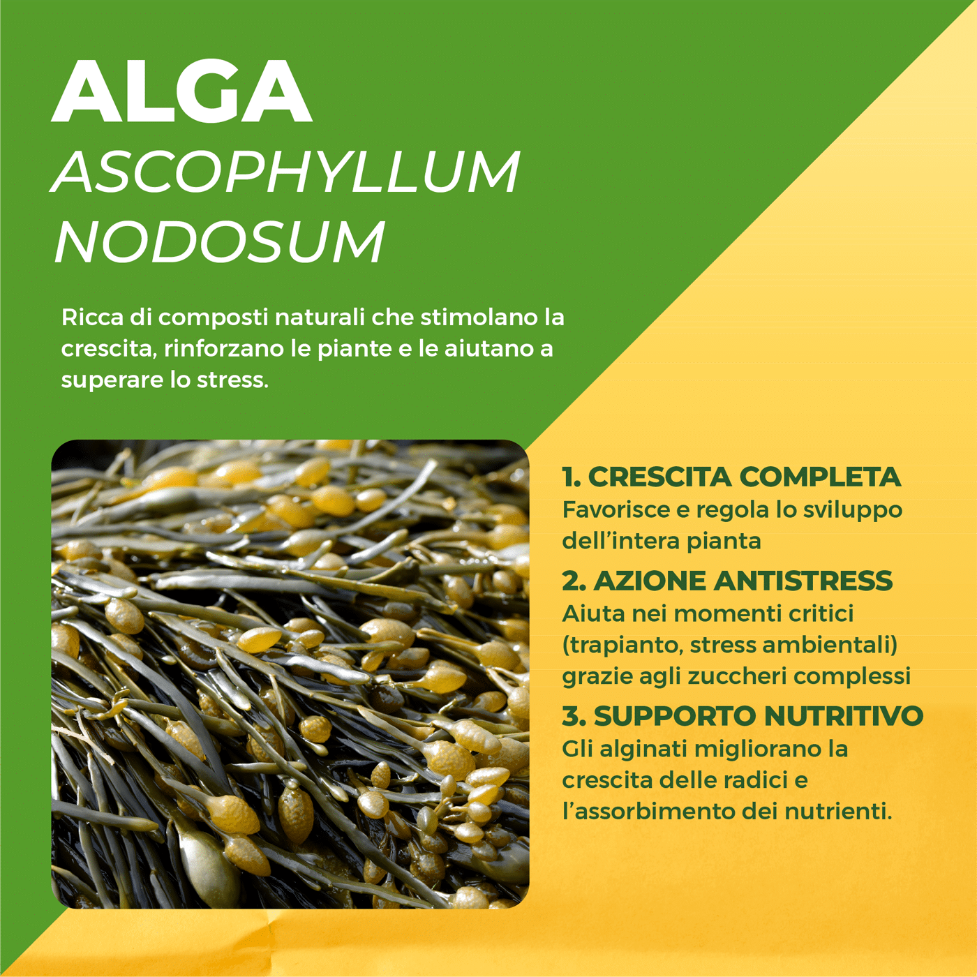 Il mix equilibrato di nutrienti, carbonio organico e composti attivi da alghe brune favorisce crescita equilibrata, sviluppo radicale e aumenta fioritura e fruttificazione.