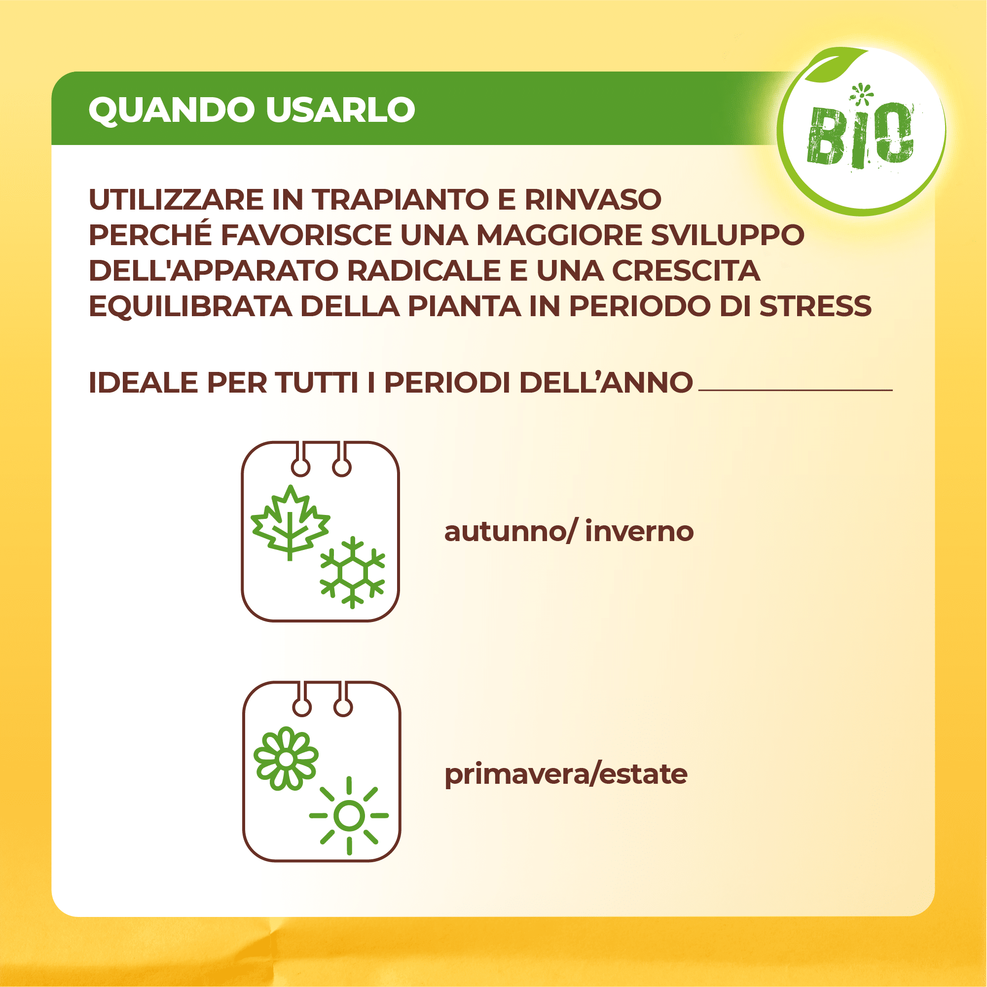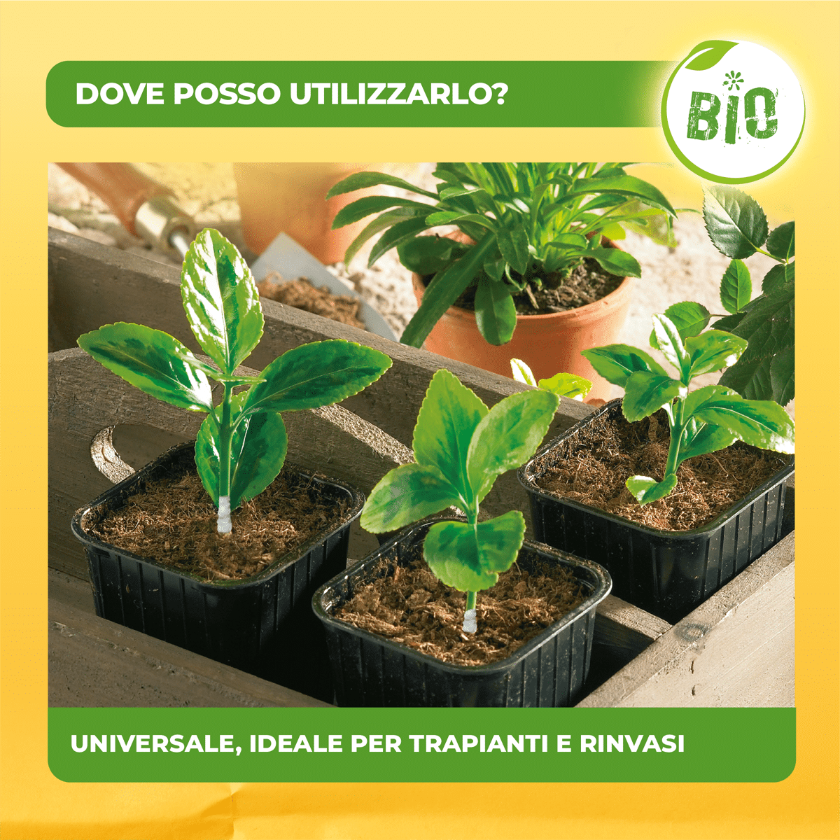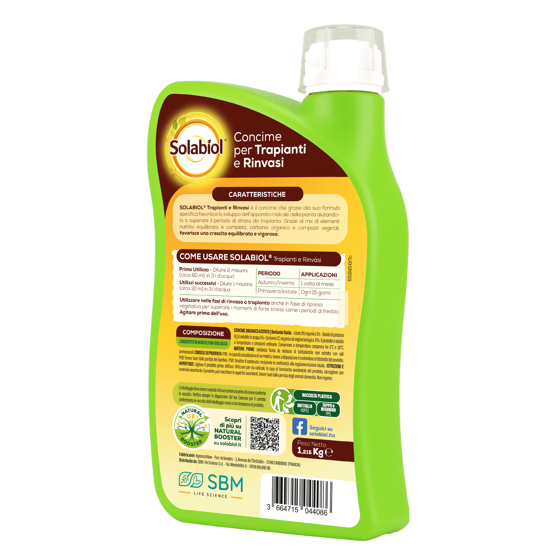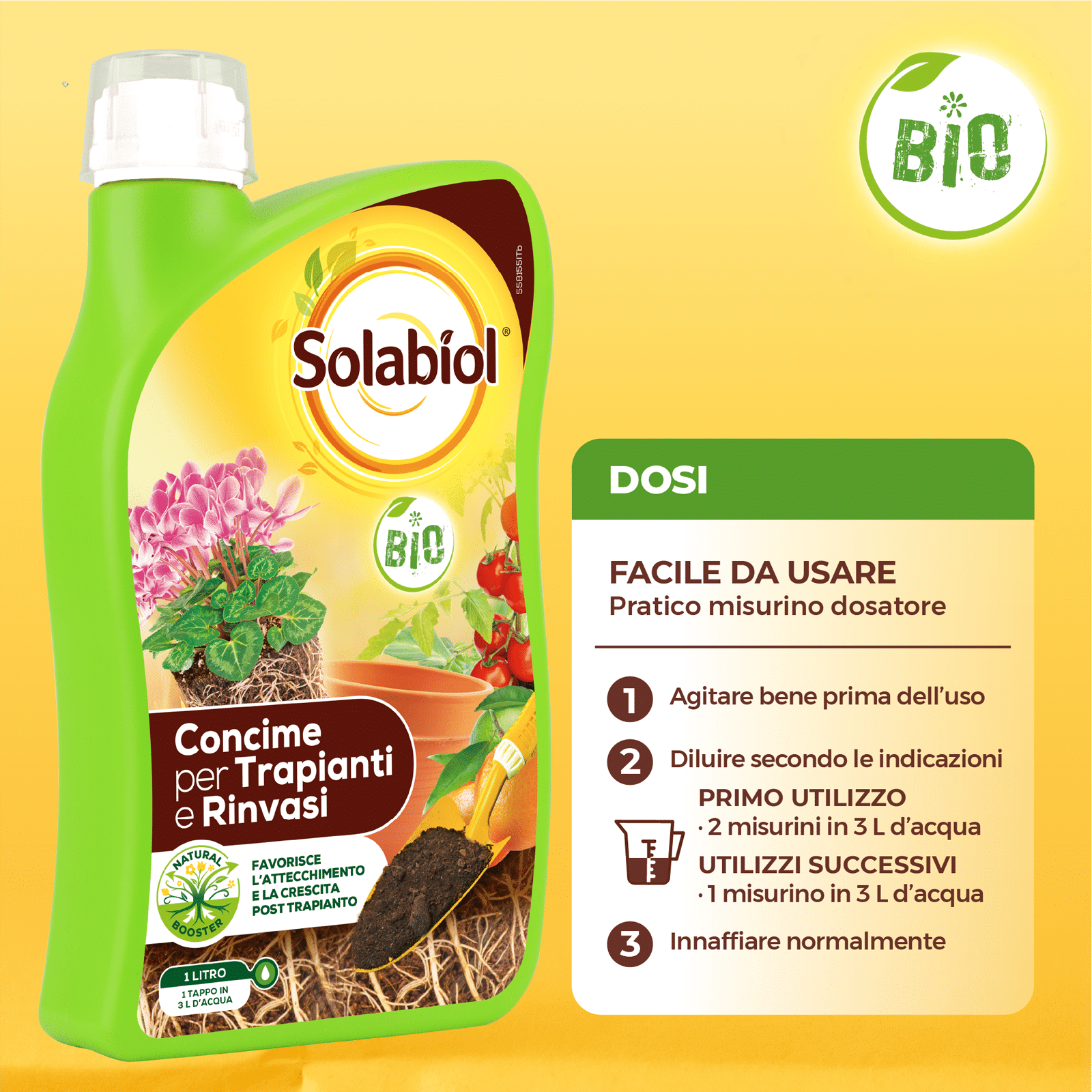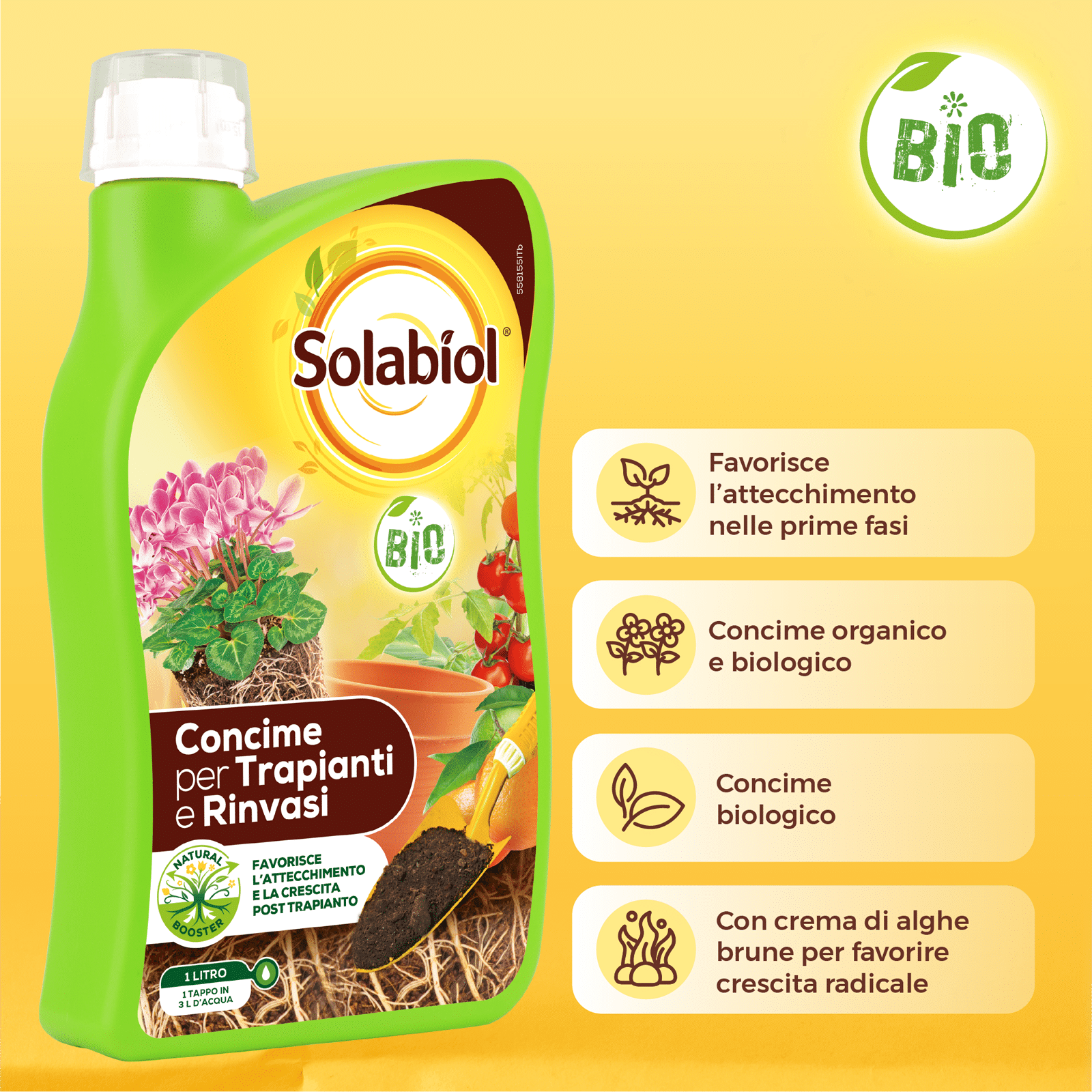 Solabiol® Trapianti e Rinvasi è il concime ideale da applicare durante le operazioni di trapianto e rinvaso. Grazie al mix di elementi nutritivi equilibrato e completo e al carbonio organico e composti biologicamente attivi estratti dalle alghe brune, Solabiol Trapianti e rinvasi favorisce una crescita equilibrata, un maggior sviluppo dell’apparato radicale e produzioni superiori aiutando la pianta a superare il periodo di stress da trapianto.