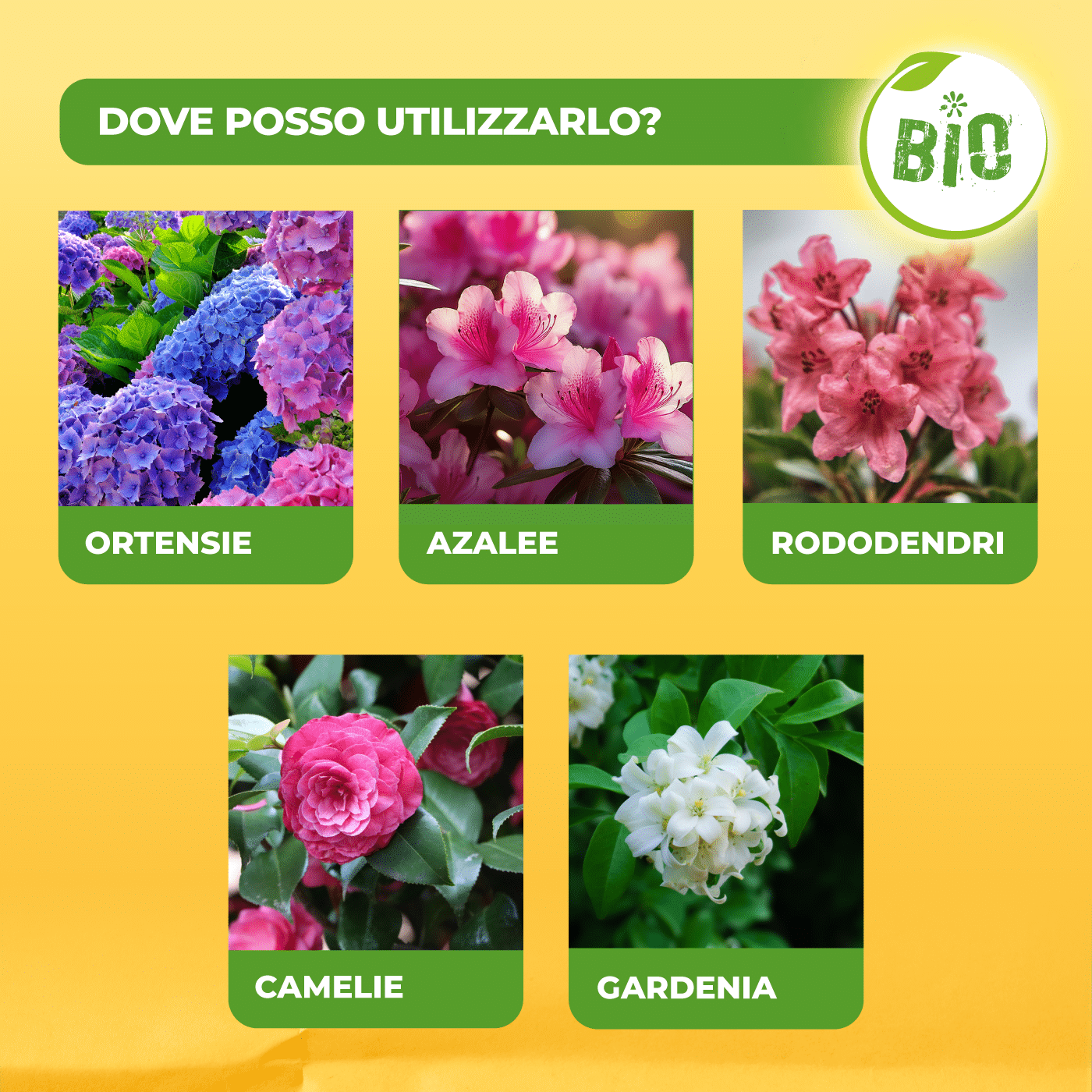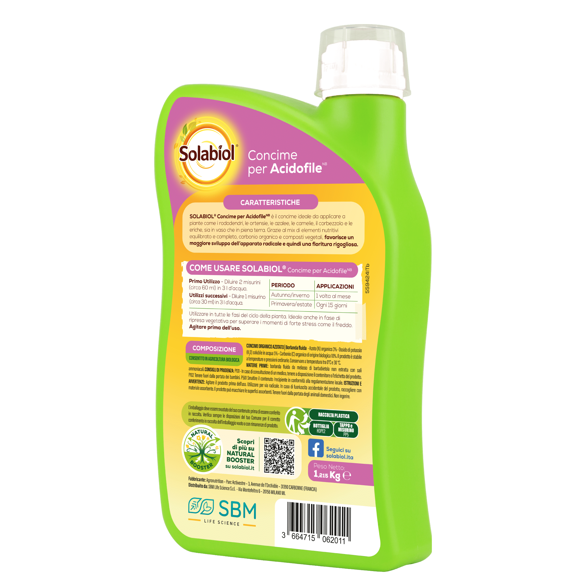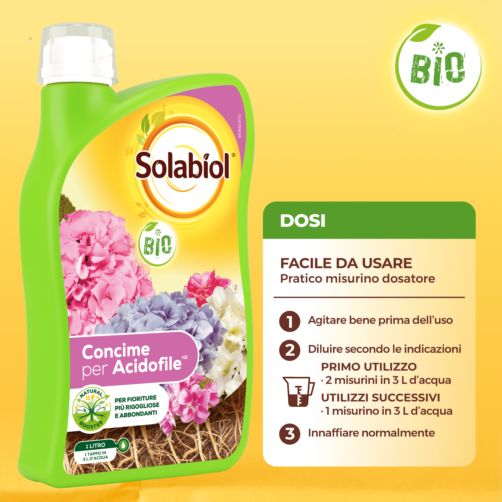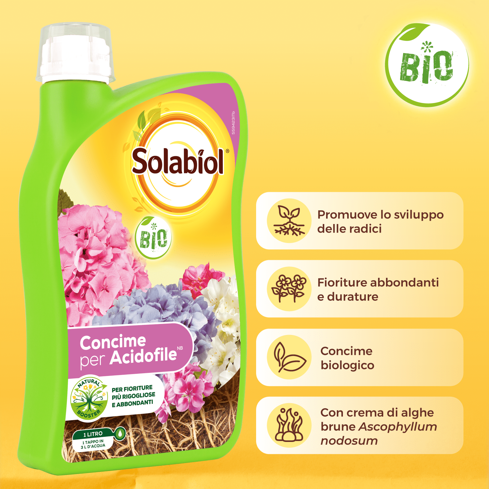 Solabiol liquido Acidofile è ideale per azalee, ortensie, rododendri e tutte le piante acidofile coltivate in vaso o piena terra. Grazie al mix equilibrato di elementi nutritivi, carbonio organico e composti biologicamente attivi estratti dalle alghe brune, favorisce una crescita armoniosa, un maggiore sviluppo dell’apparato radicale e fioriture abbondanti e durature.