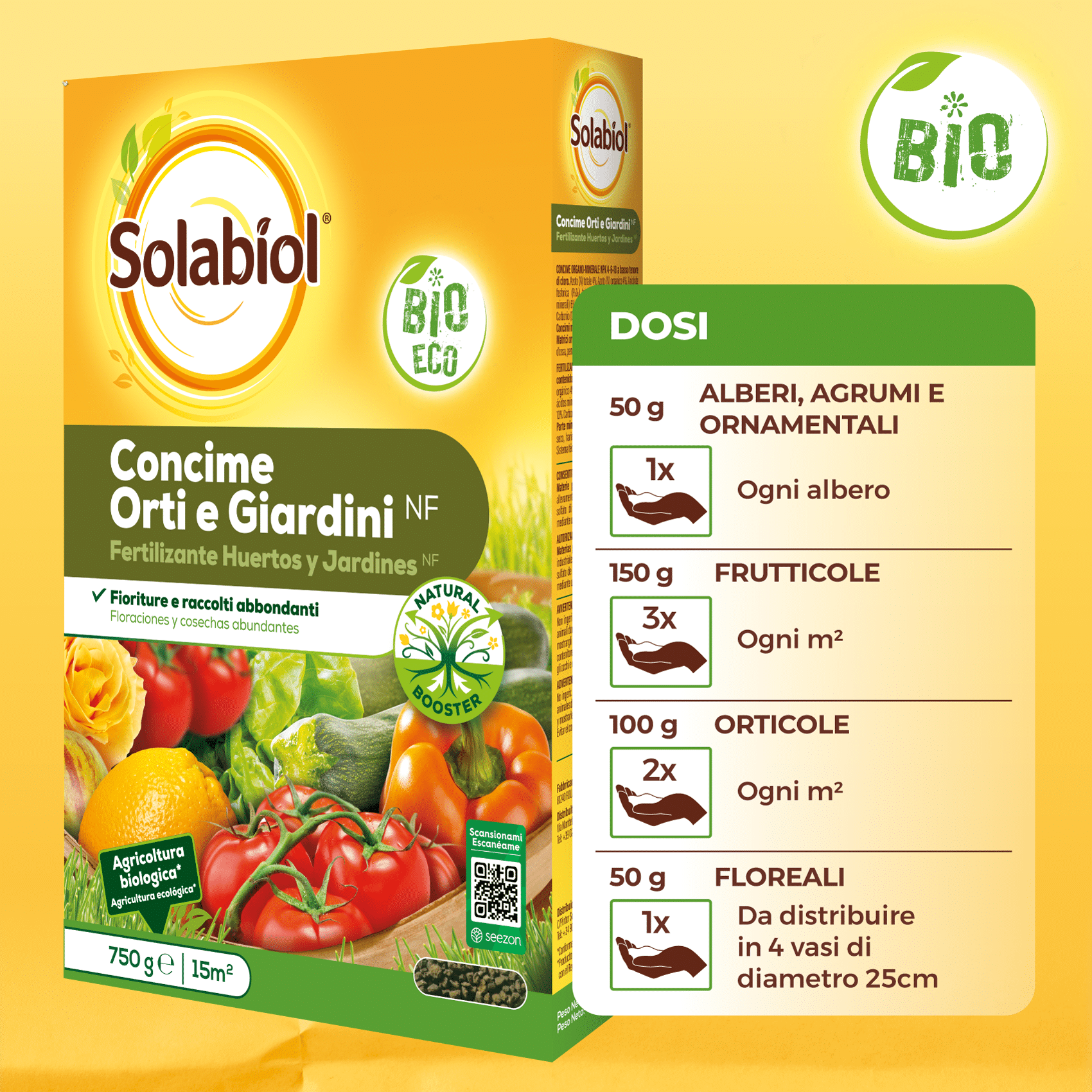 Solabiol Orti e Giardini è un concime granulare 100% naturale con l’esclusiva tecnologia Natural Booster. Favorisce lo sviluppo dell’apparato radicale, stimolando la crescita di piante sane e rigogliose. Grazie a questo concime, le piante diventano più resistenti all’attacco di insetti e parassiti.