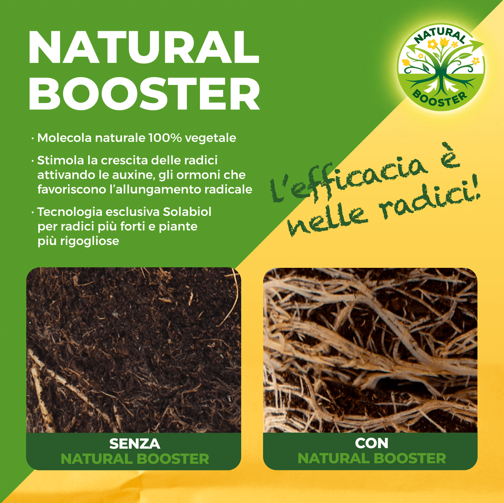 La speciale tecnologia Natural Booster promuove un maggior sviluppo dell’apparato radicale della pianta fino a farlo raddoppiare. Grazie ad un apparato radicale più sviluppato la pianta può arrivare a produrre fino al 50% di raccolto in più e fino al doppio delle fioriture. Una pianta con radici più forti sarà anche più resitente all’attacco di insetti e parassiti.