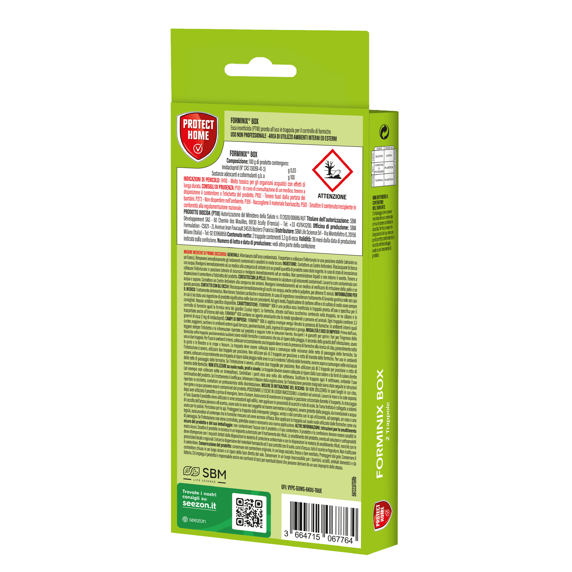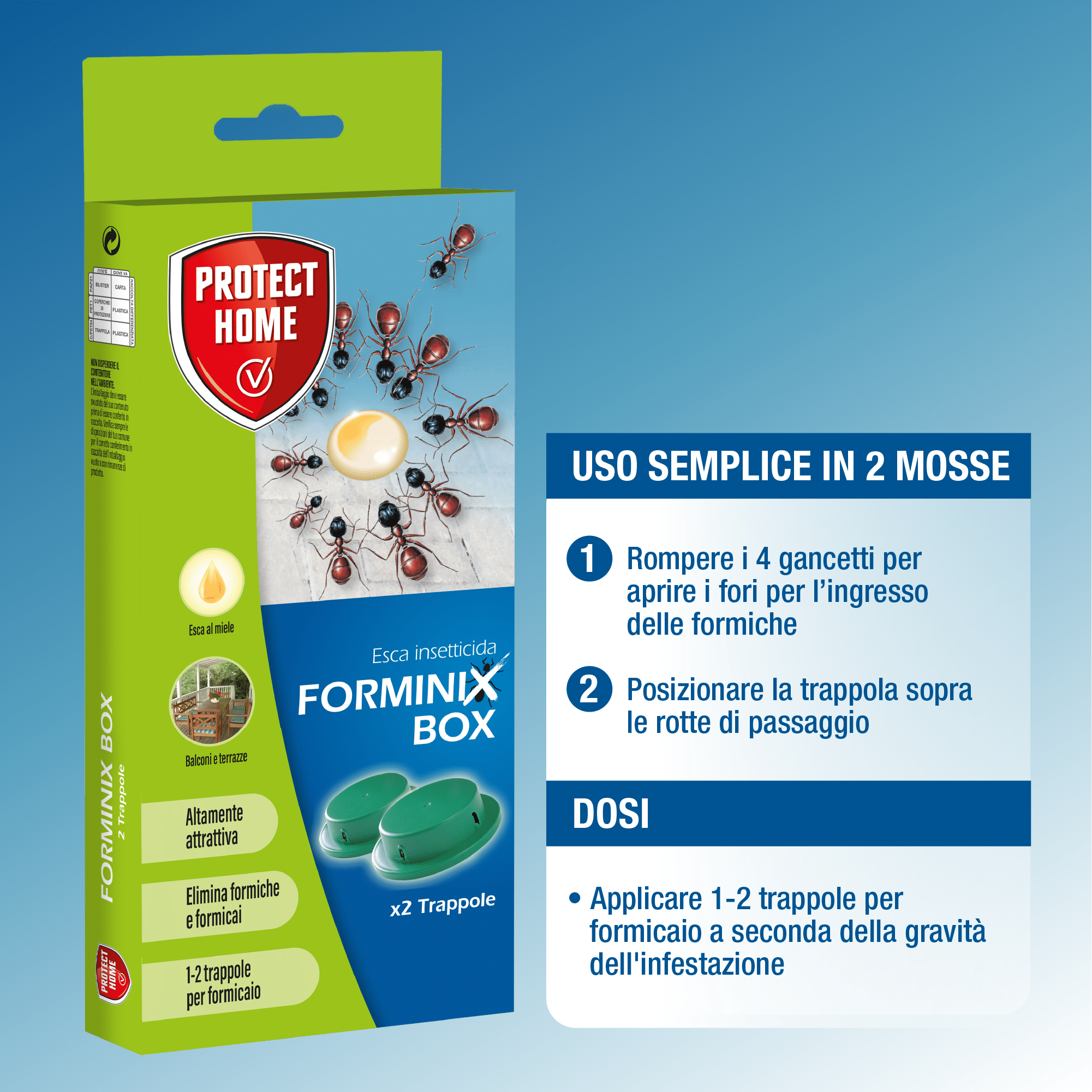 Le formiche, attratte dall’esca contenuta nella trappola, se ne cibano e la trasportano anche all’interno del nido eliminando così anche i formicai. L’esca ha un doppio potere attrattivo basato su una formulazione con granulo zuccherino e base