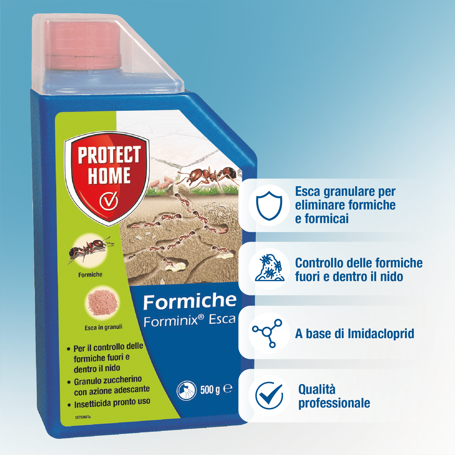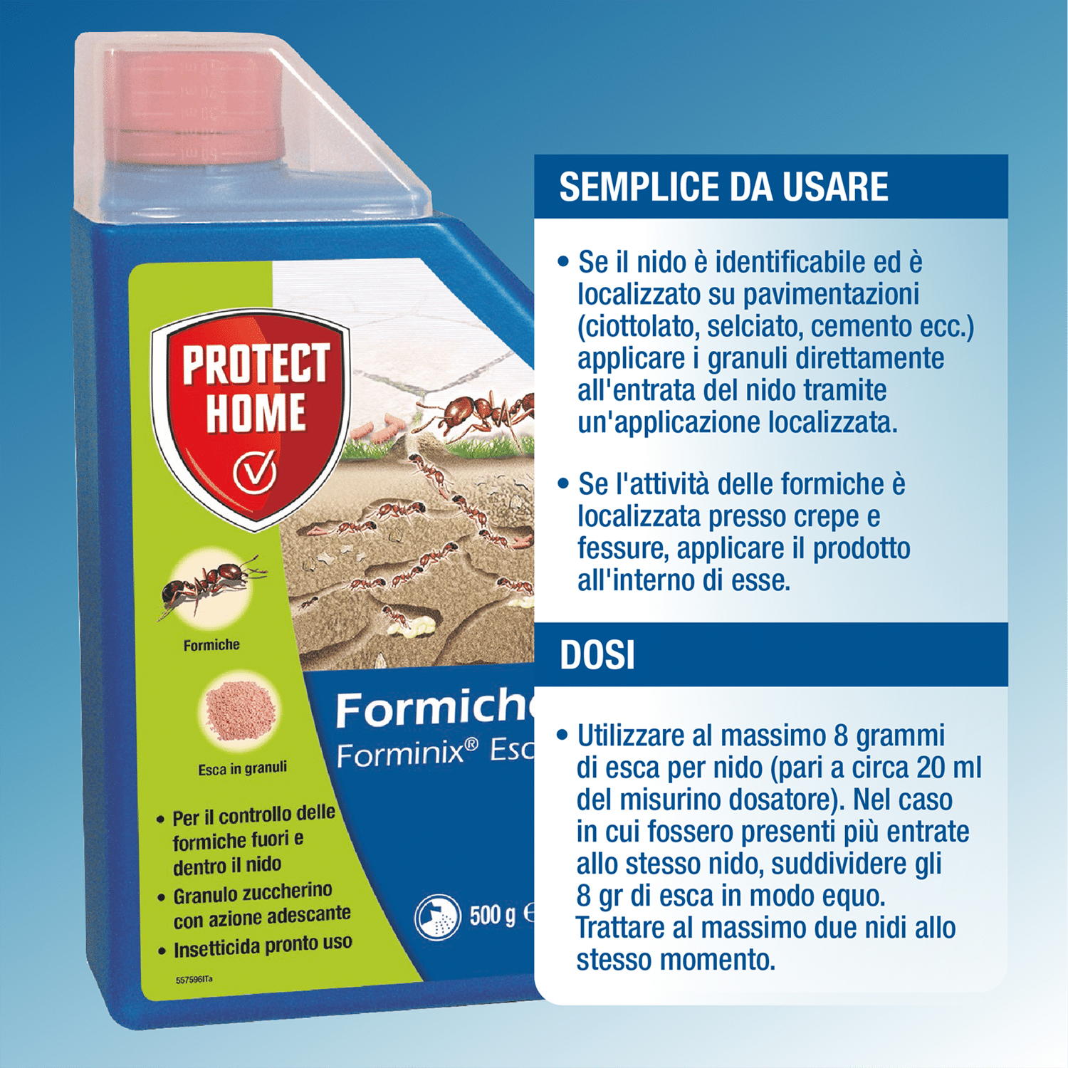 Forminix Esca possiede un’azione adescante per il controllo delle formiche, fuori e dentro il nido. L’esca zuccherina è portata dalle formiche operaie all’interno del formicaio dove esplica la sua azione insetticida. Agisce quindi eliminando il nido e risolvendo il problema alla radice.