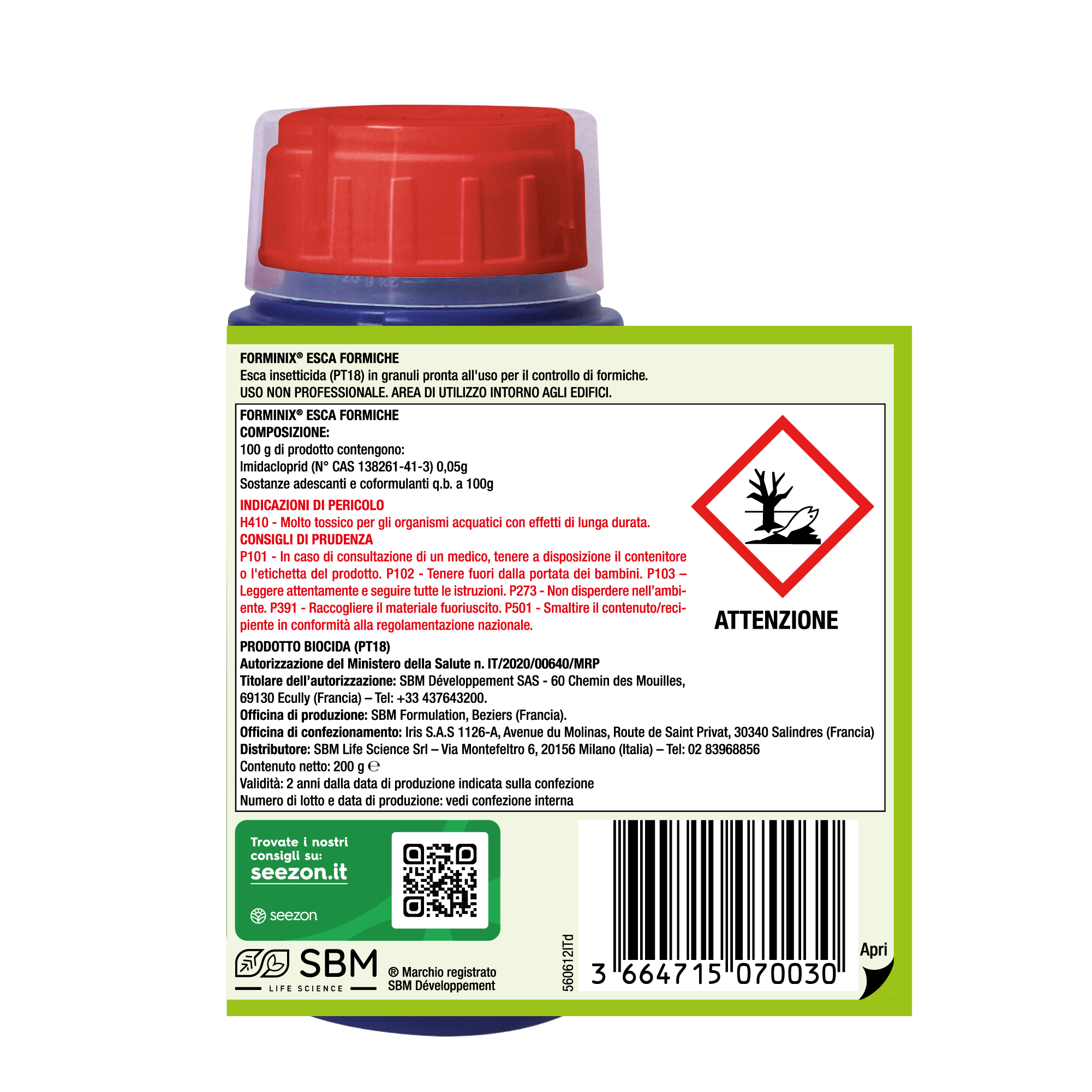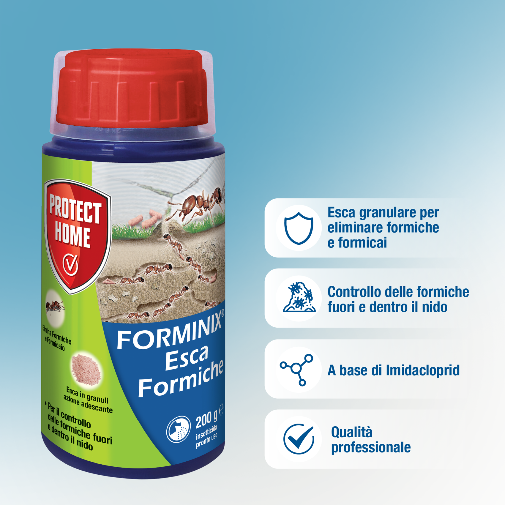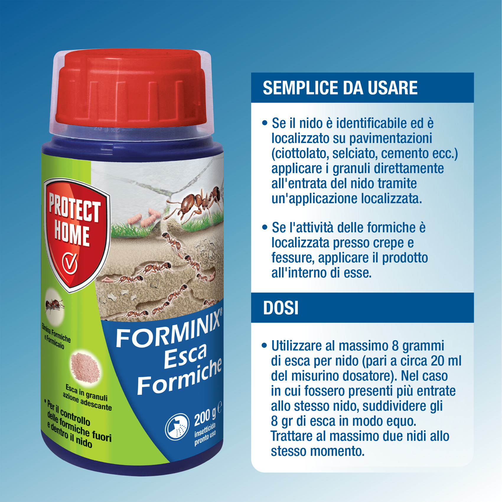 Forminix Esca possiede un’azione adescante per il controllo delle formiche, fuori e dentro il nido. L’esca zuccherina è portata dalle formiche operaie all’interno del formicaio dove esplica la sua azione insetticida. Agisce quindi eliminando il nido e risolvendo il problema alla radice.