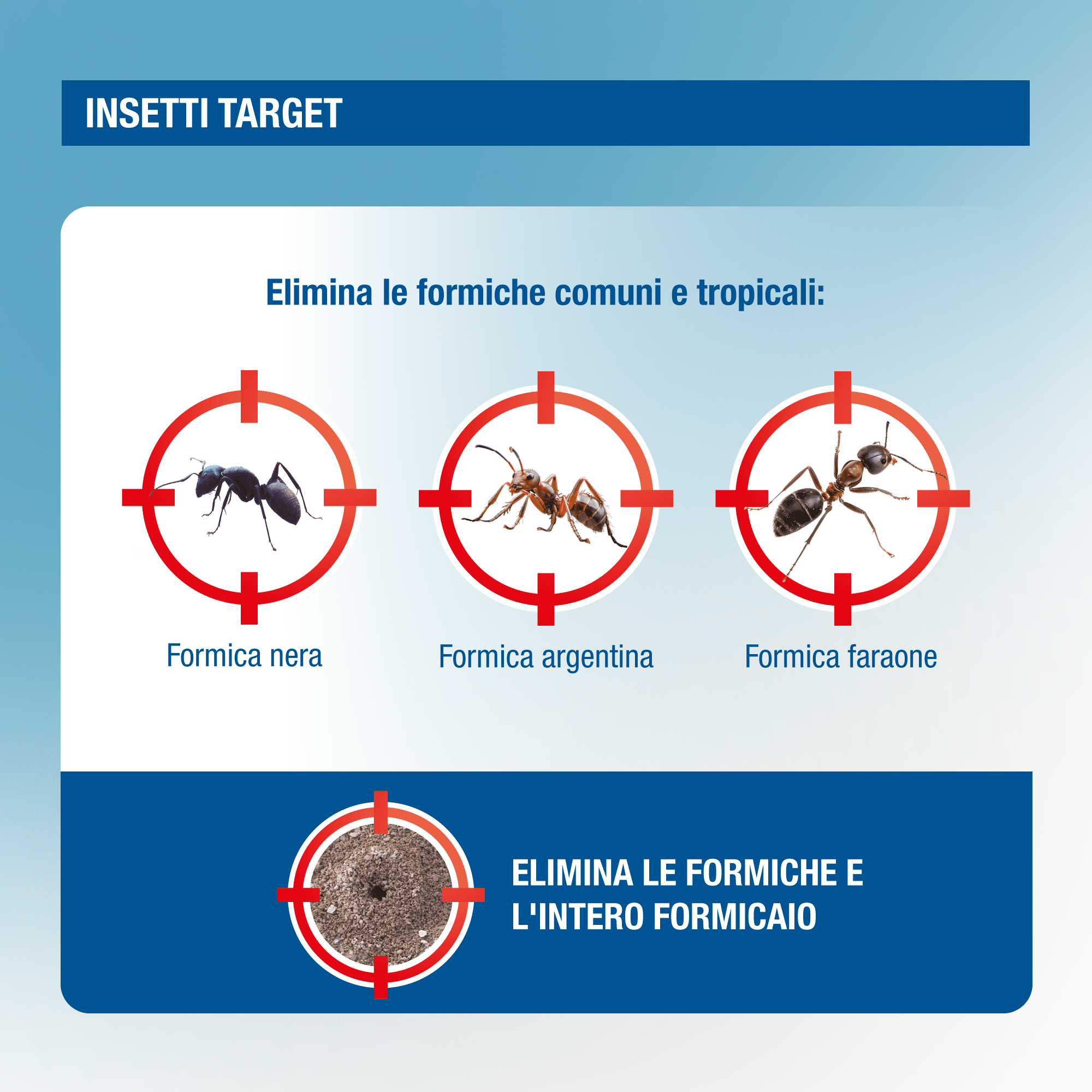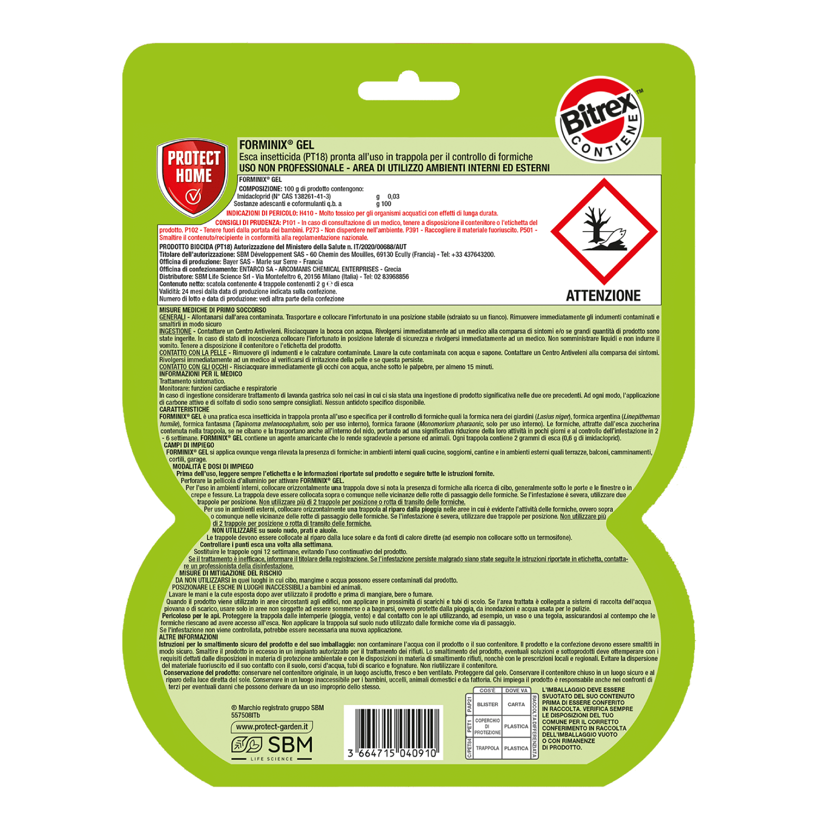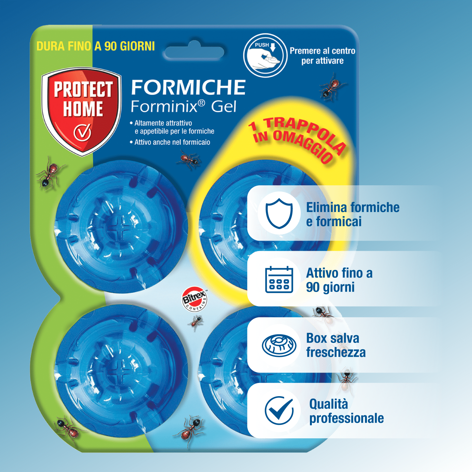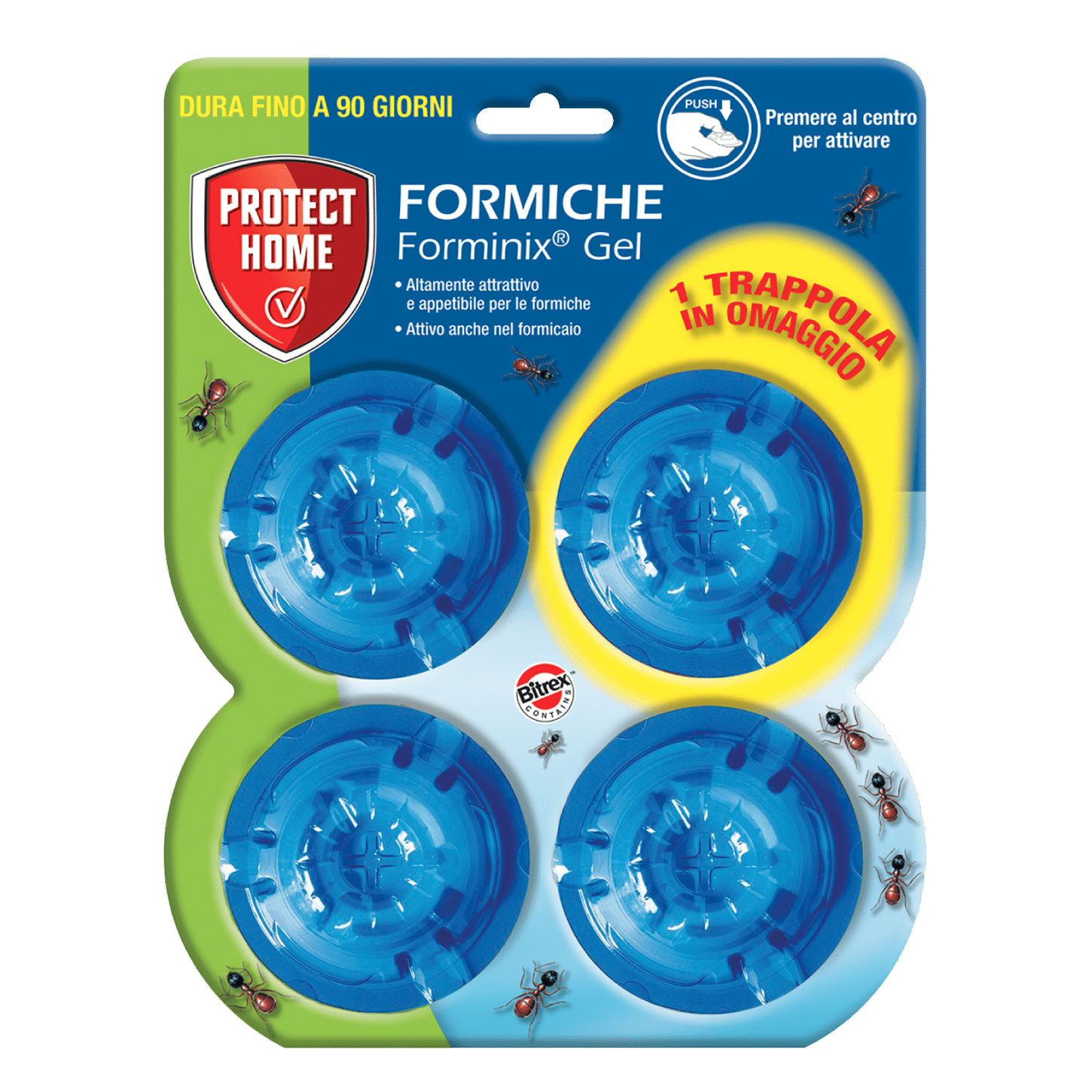 Forminix® Gel è un insetticida in box esca altamente attrattivo verso le principali specie di formiche che infestano gli ambienti domestici. Il formulato in gel liquido mantiene a lungo la sua azione attrattiva e viene trasportato nel formicaio che sarà eliminato nel giro di qualche settimana.