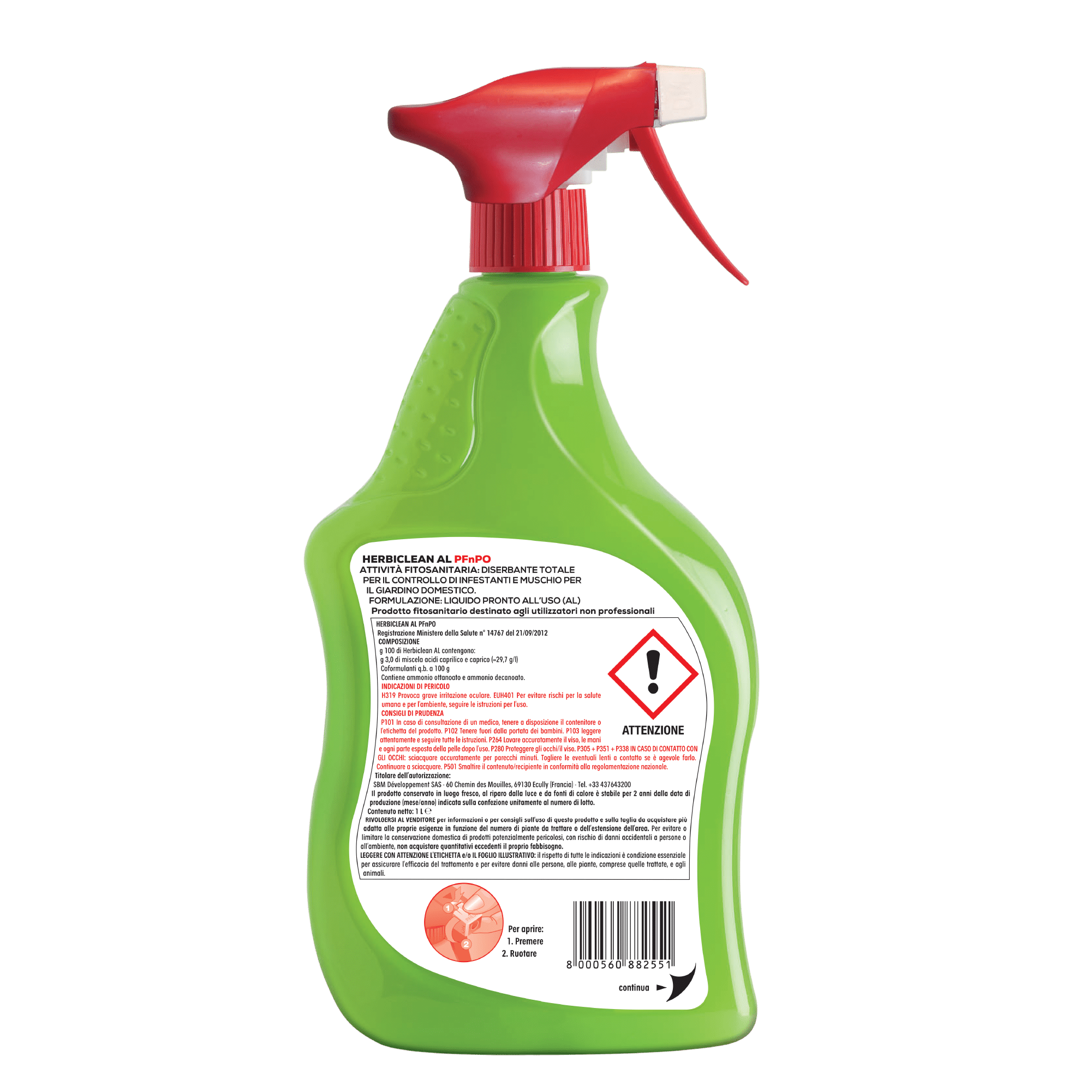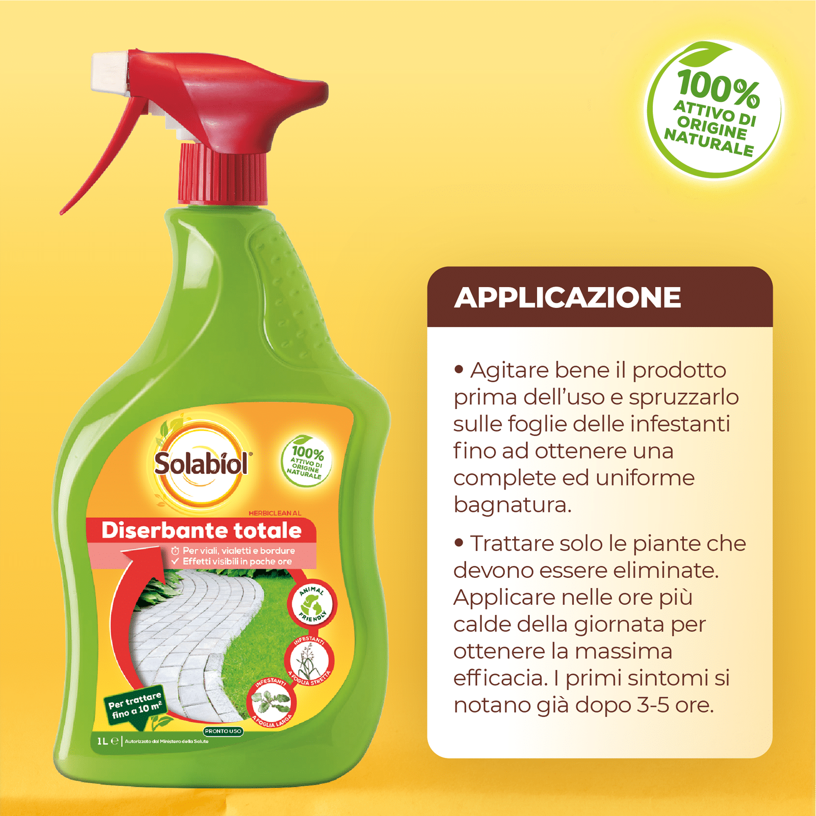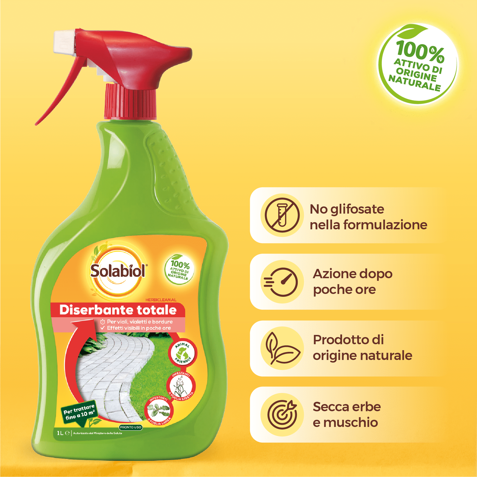 Solabiol Herbiclean è un’ erbicida pronto all’uso, totale e non residuale a base di acidi grassi comunemente presenti in natura. Herbiclean ha una rapida azione fogliare: nel giro di poche ore tutte le foglie bagnate dal prodotto ingialliscono e muoiono. Agisce sulle parti verdi delle piante e non su quelle lignificate, quindi risulta ideale per il diserbo sottochioma di alberi e arbusti. Inoltre è indicato per tenere puliti vialetti e bordure e per pulire dal muschio pavimentazioni e arredi del giardino in pietra o cemento, nonché tronchi esposti a nord. Il prodotto si presenta in una comoda pompetta spray pronta all’uso composta da plastica al 97% riciclata.