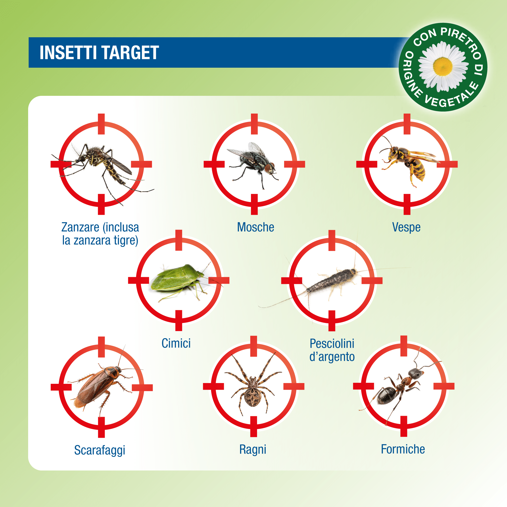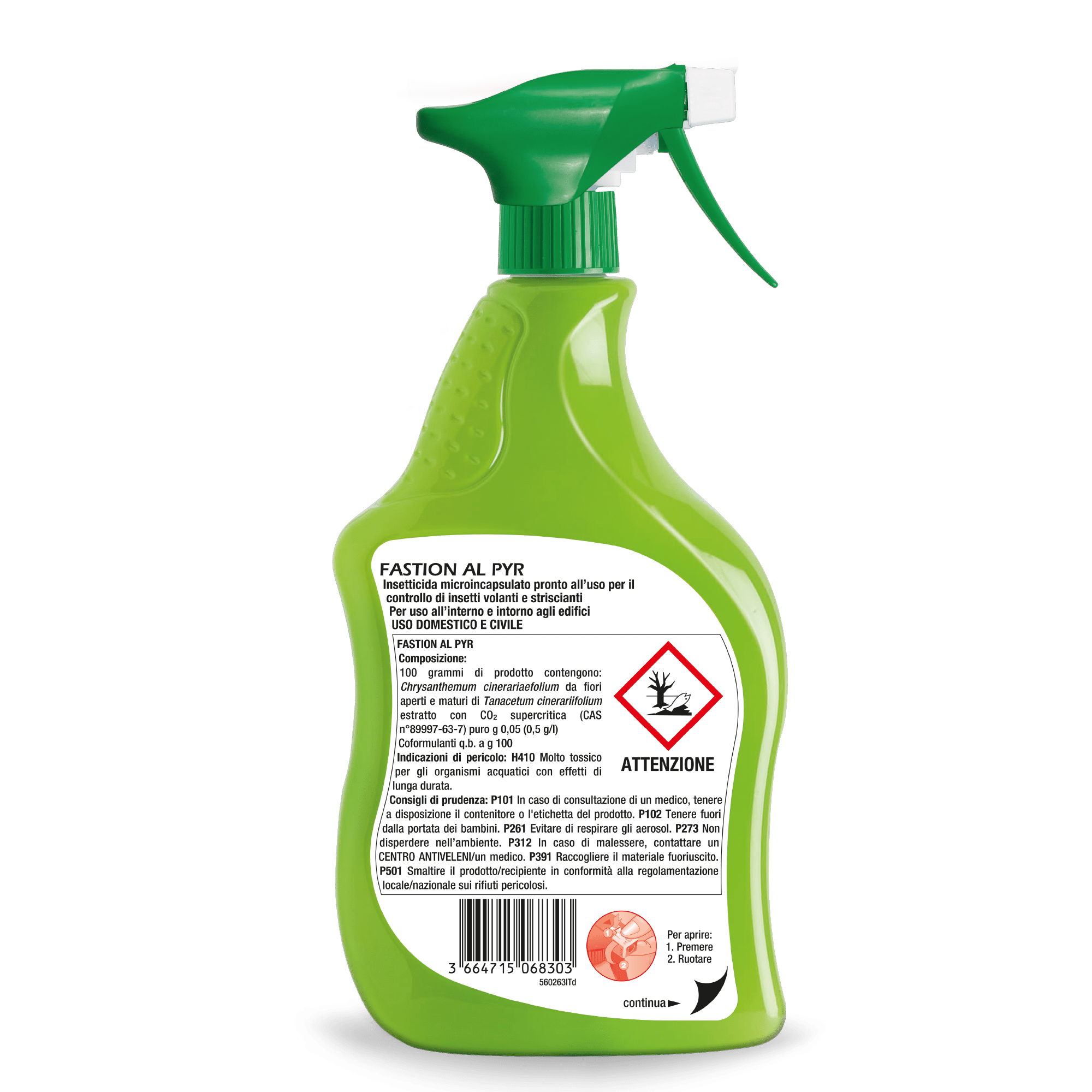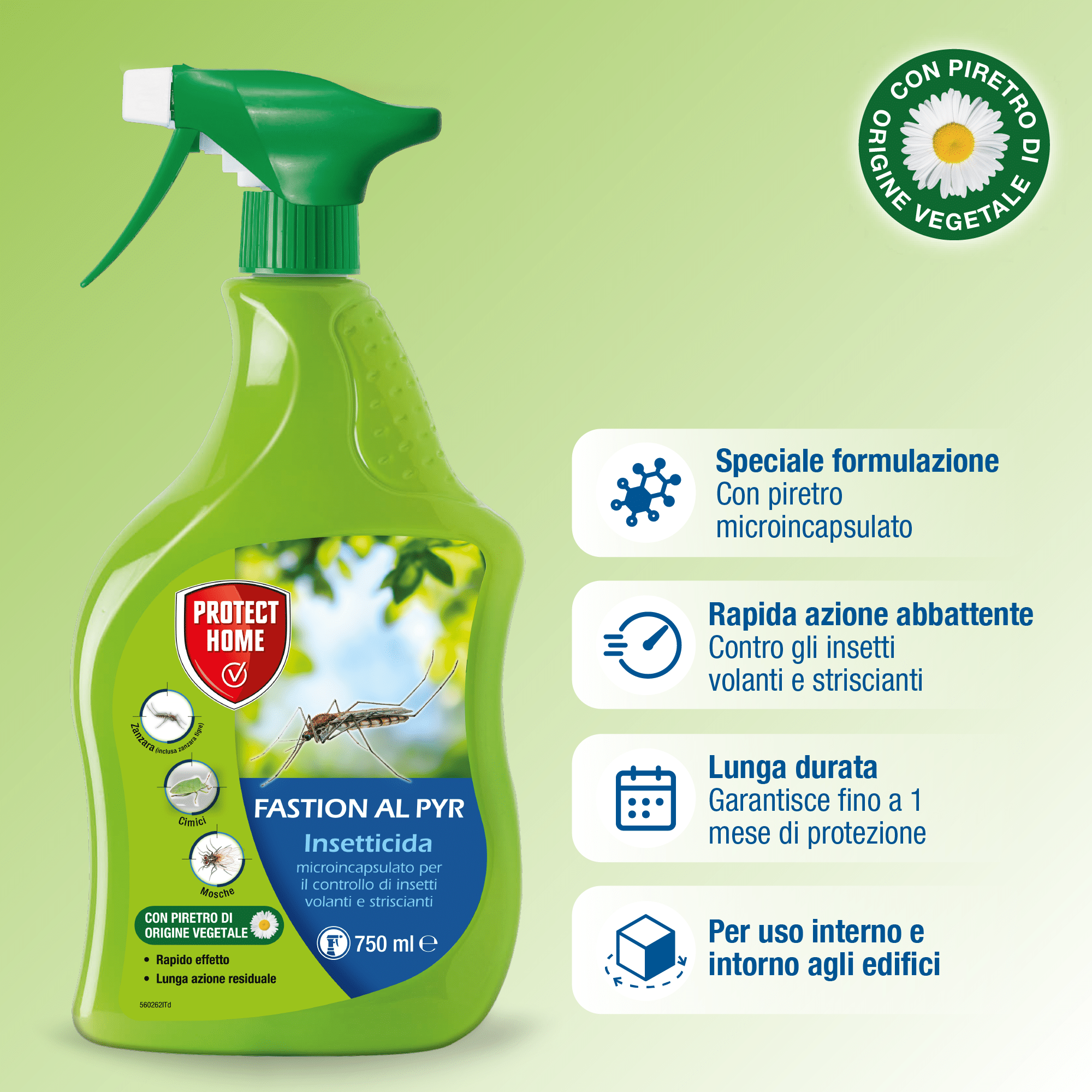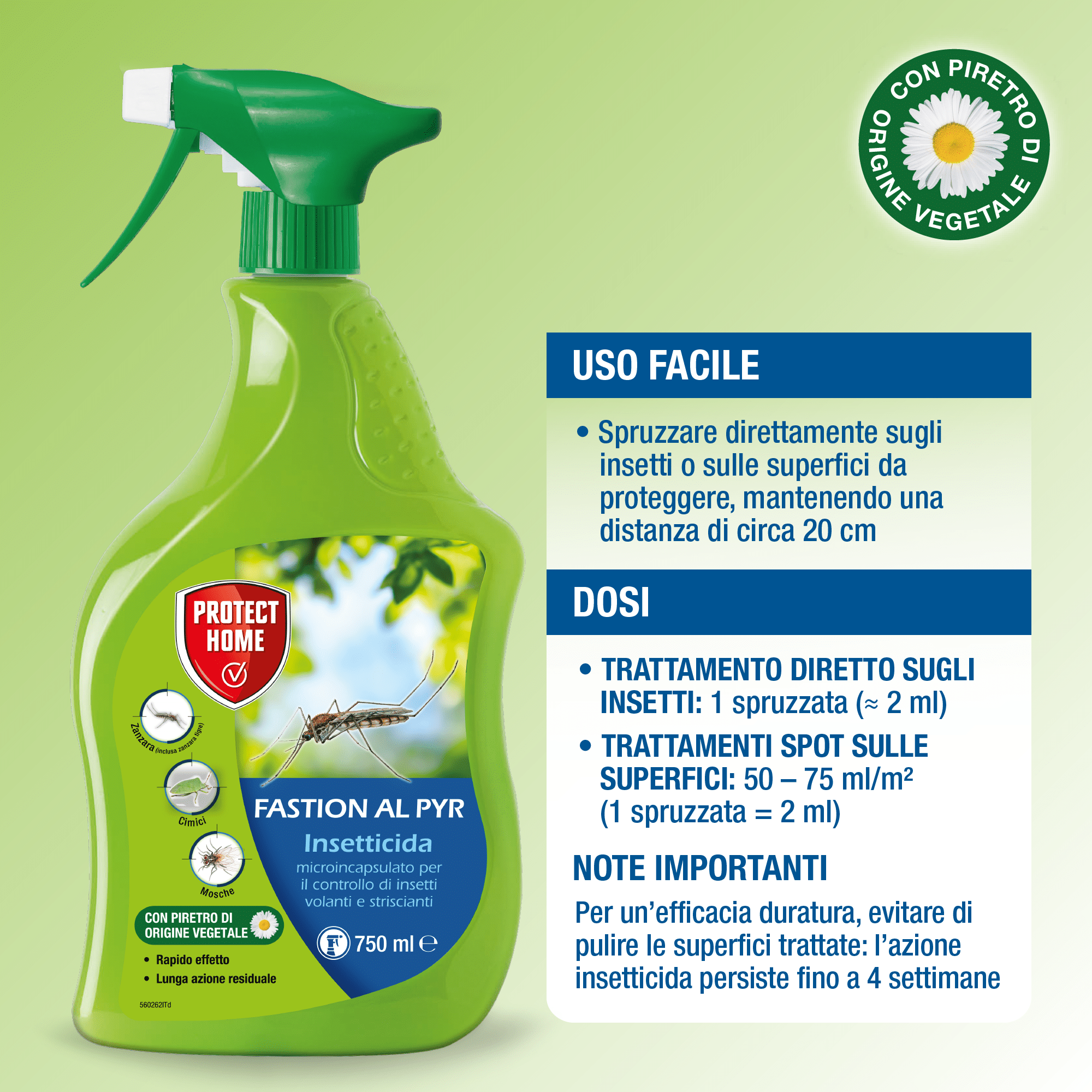 Fastion AL PYR è un insetticida per il controllo di insetti volanti e striscianti: Zanzare, Mosche, Scarafaggi, Formiche, Cimici a base di piretro.