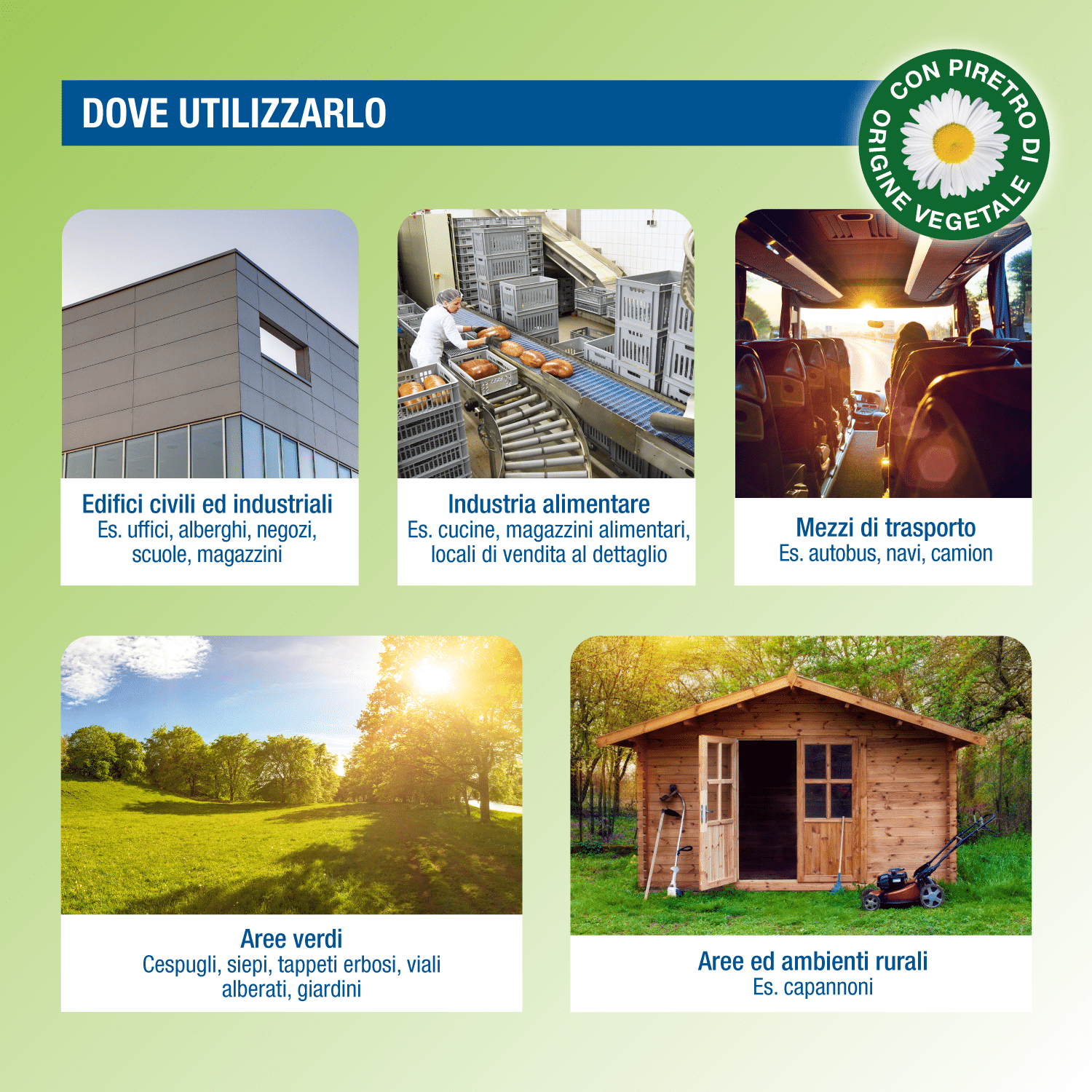 È registrato per uso su aree esterne come cespugli, tappeti erbosi, giardini e aree interne come edifici civili e industriali.