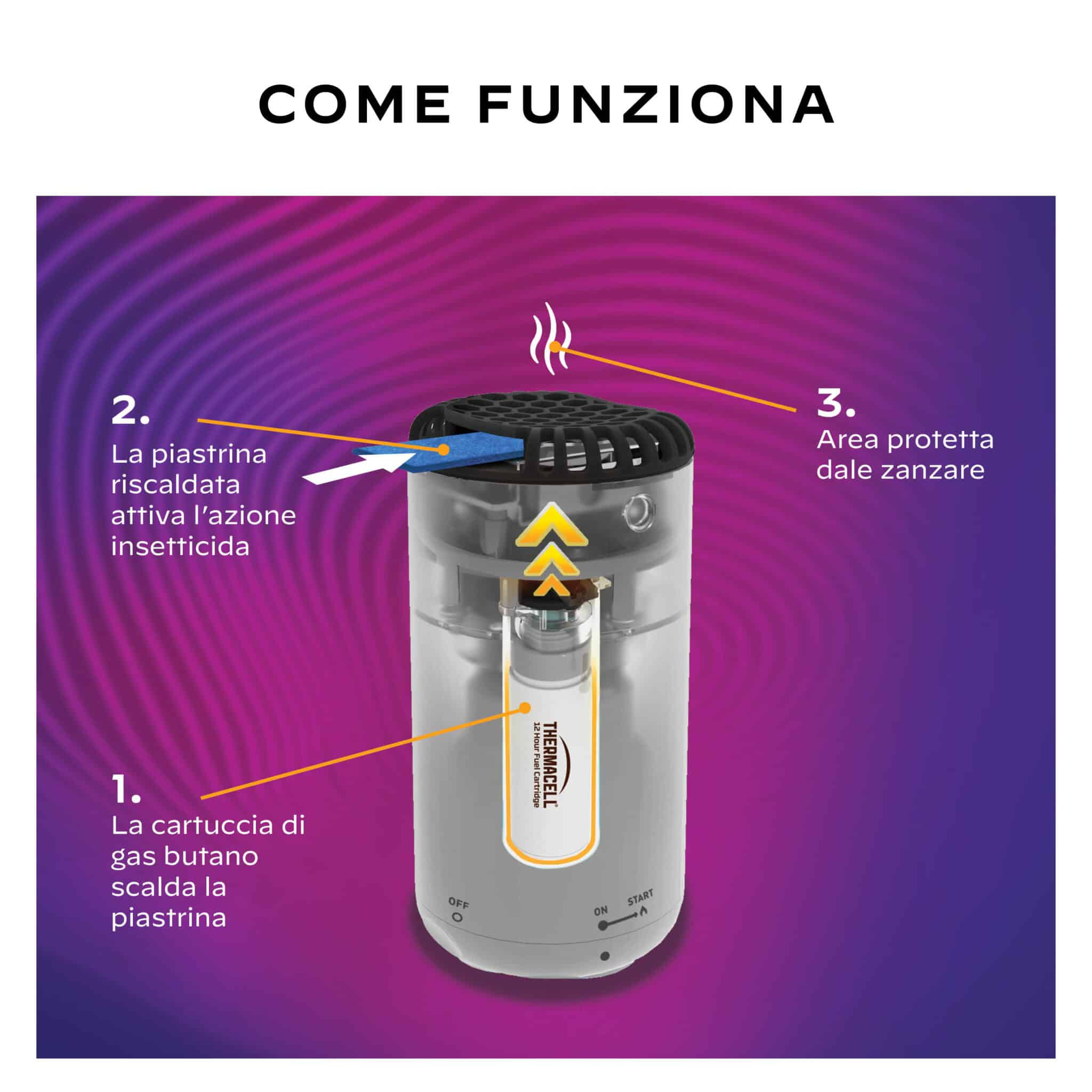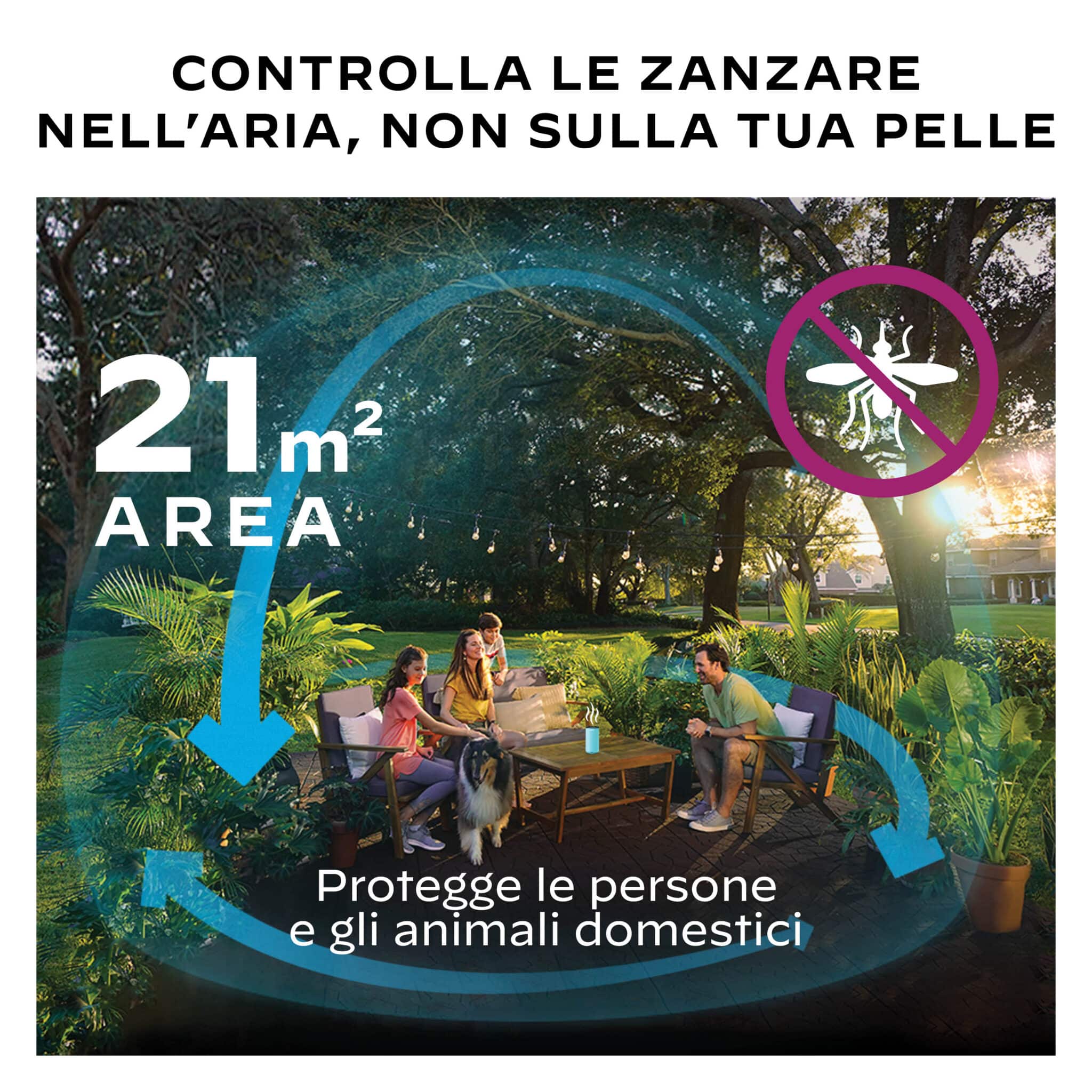 Consigli e noteIl dispositivo funziona meglio in ambienti chiusi o semi-chiusi come verande o gazebo. All’aperto in spazi molto aperti la protezione può essere meno efficace se c’è vento forte.Le cartucce di ricambio hanno una durata limitata (circa 4 ore), ma sono facili da sostituire.