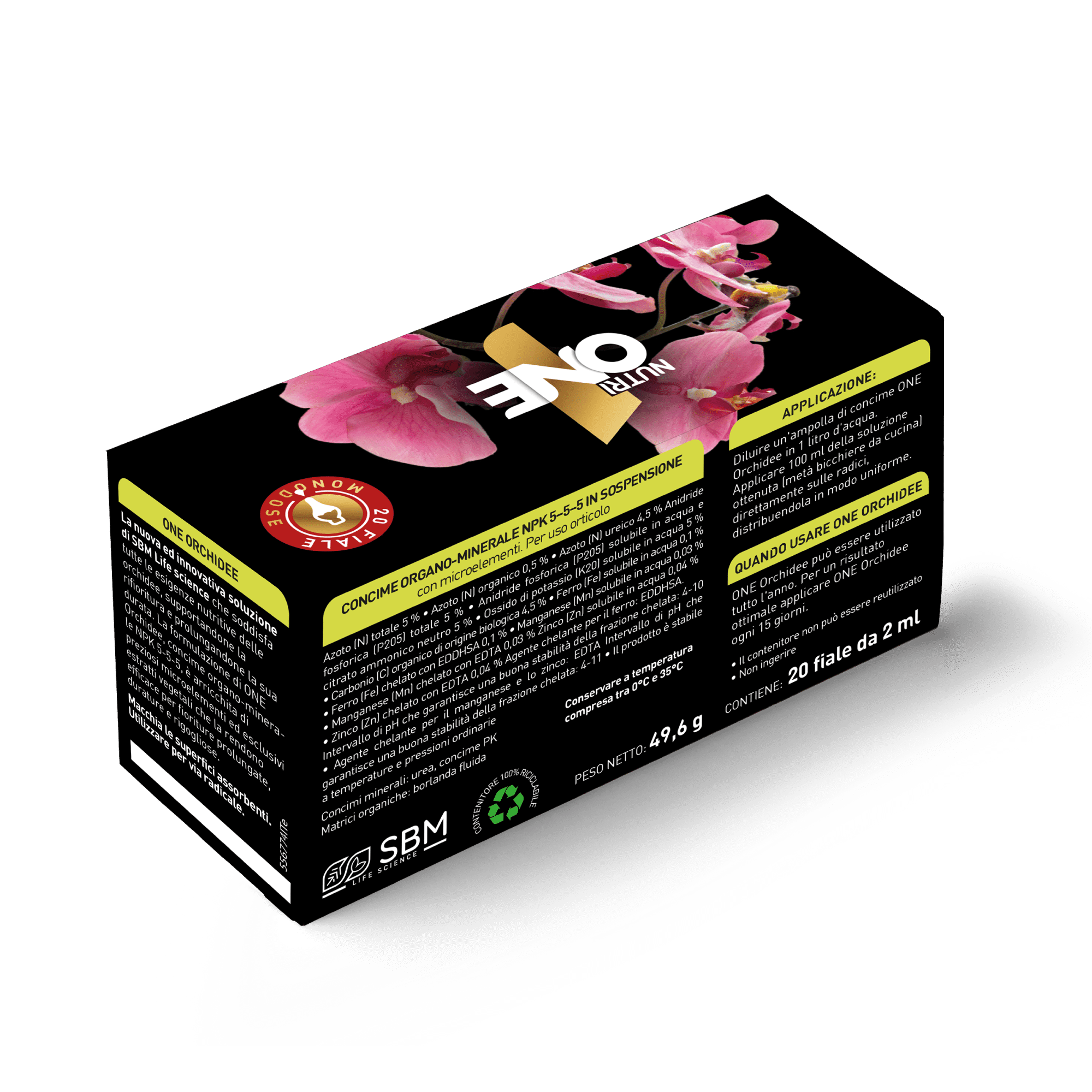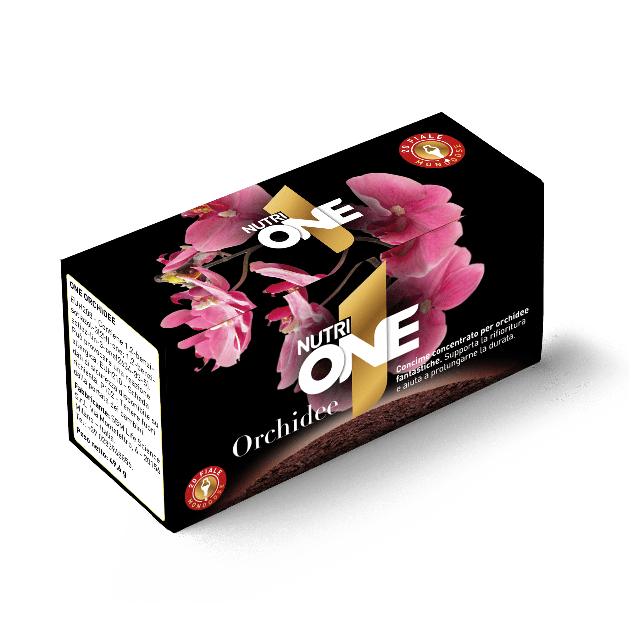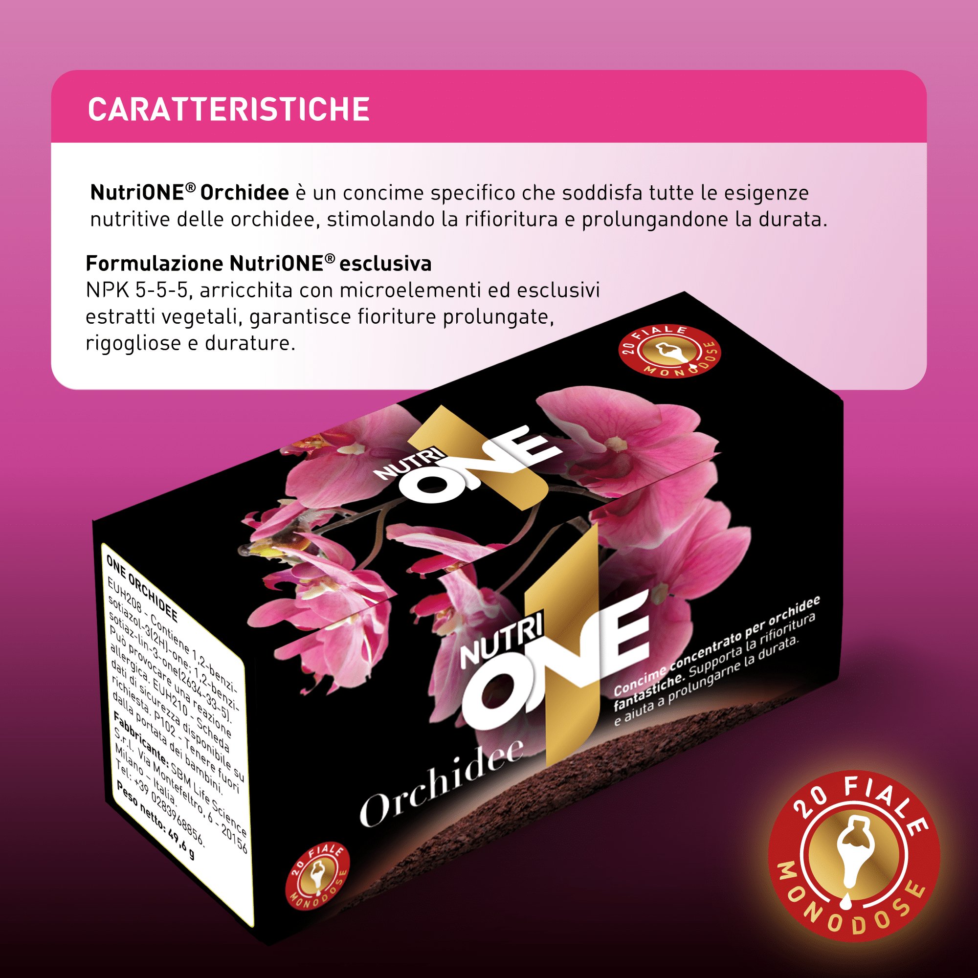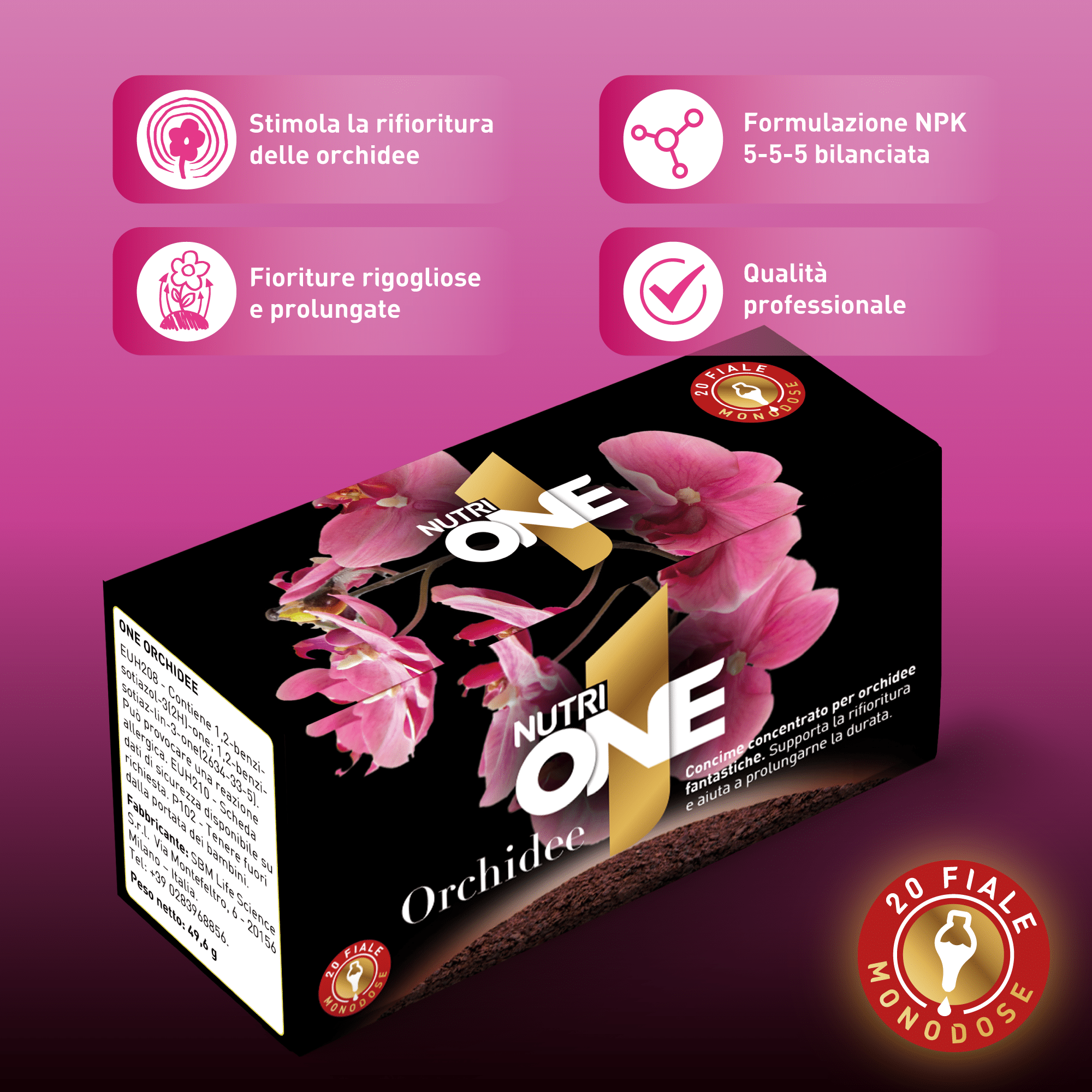La formulazione di ONE Orchidee, concime organo-minerale NPK 5-5-5, è arricchita di preziosi microelementi ed esclusivi estratti vegetali la rendono efficace per fioriture prolungate, durature e rigogliose.