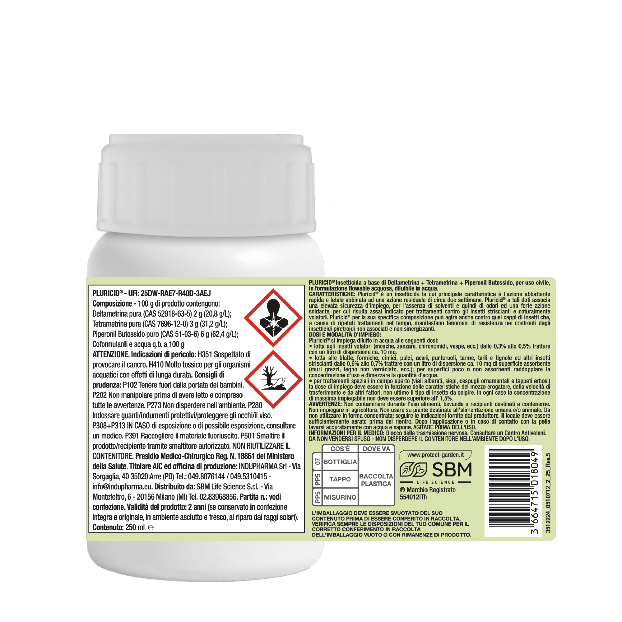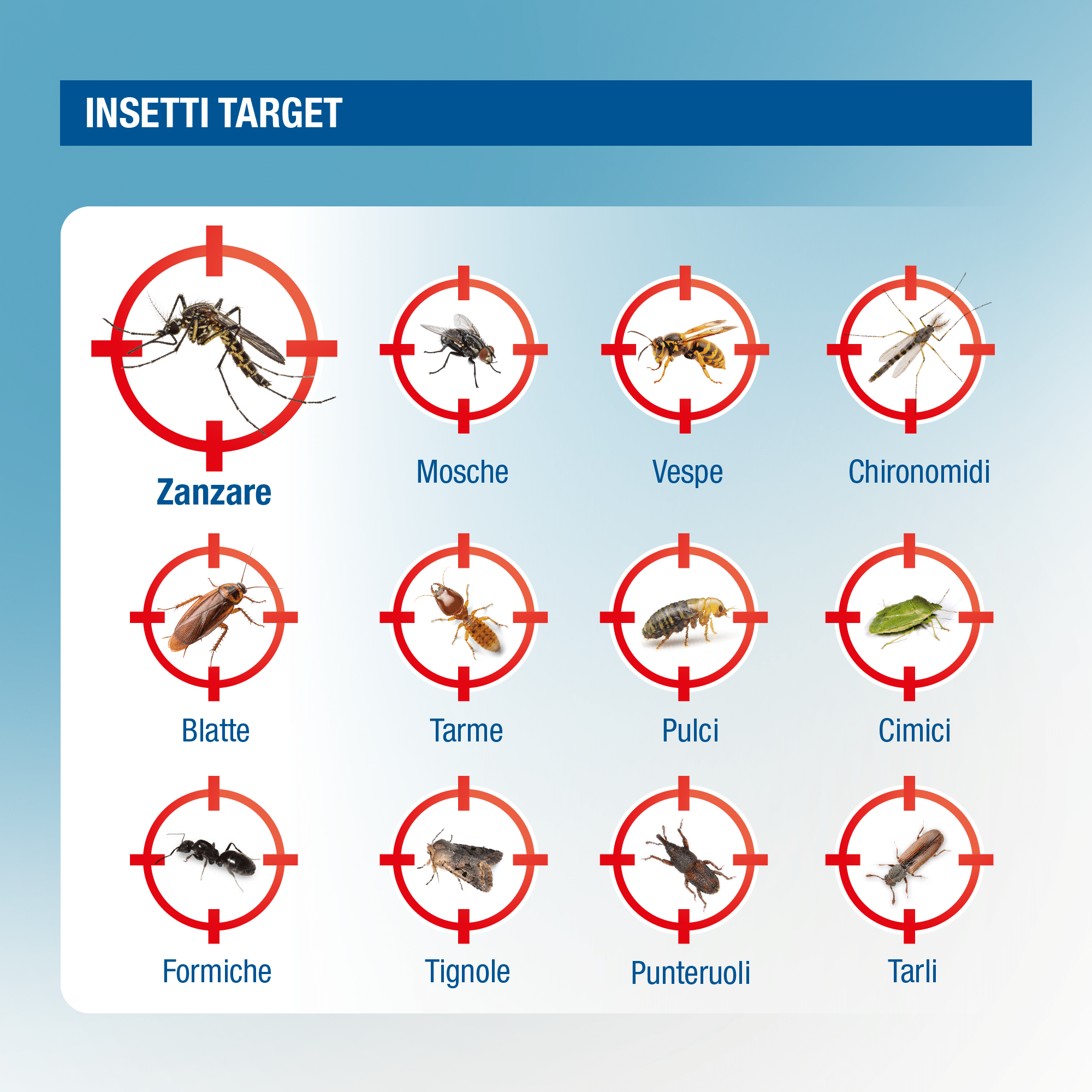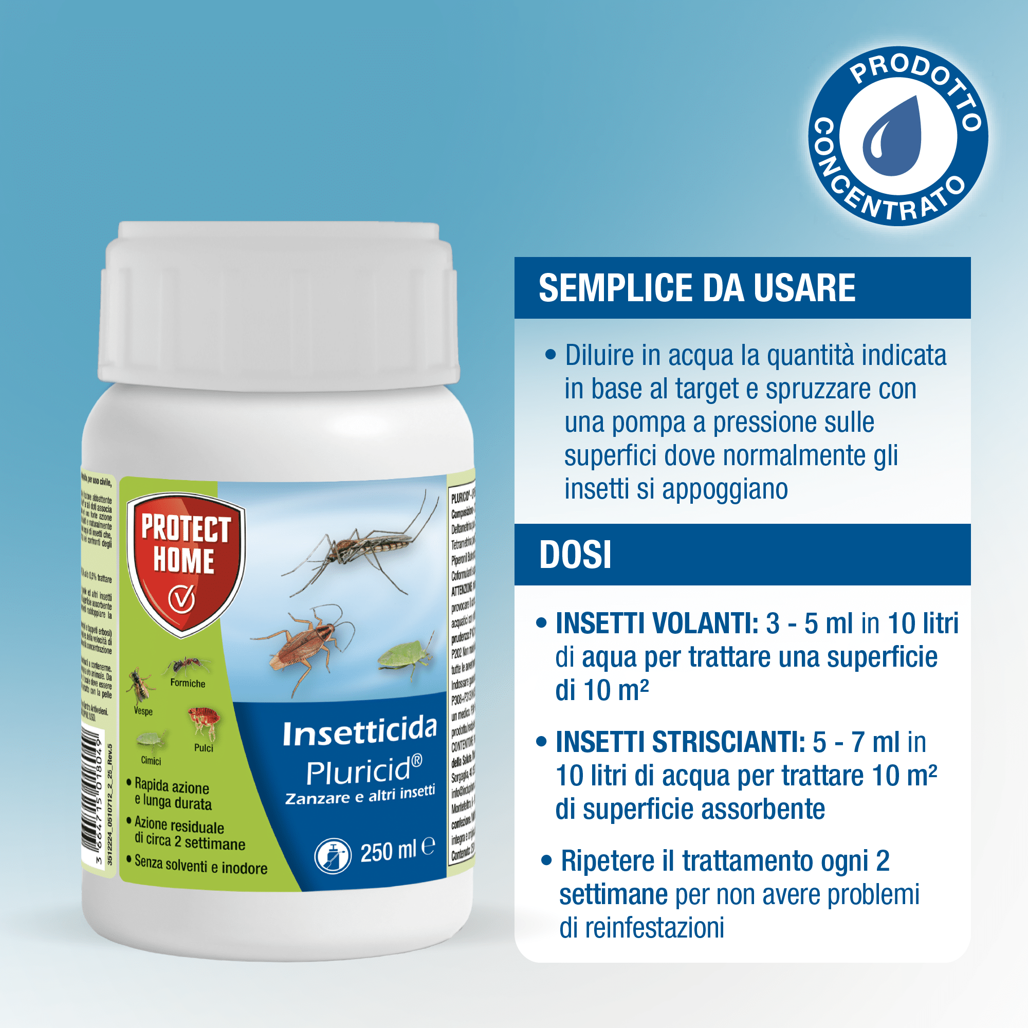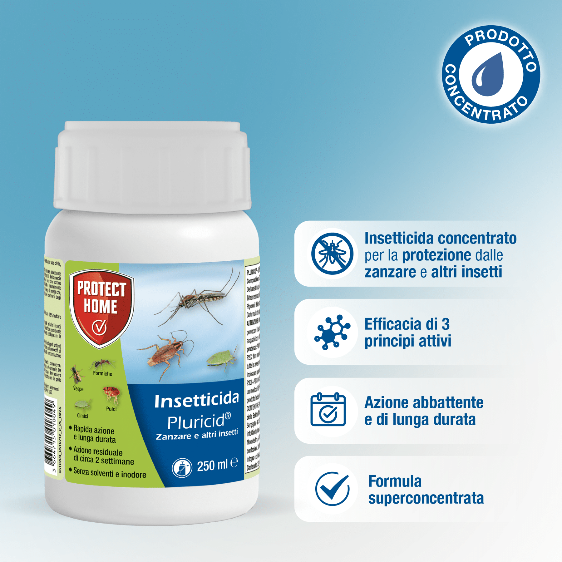 Pluricid grazie alla sua speciale formulazione, ha una rapida azione abbattente, effetti di lunga durata sulla zanzara tigre e la zanzara comune a dosaggi molto bassi, la metà di quelli degli insetticidi tradizionali. Efficace anche su mosche, scarafaggi, formiche ed altri insetti striscianti.