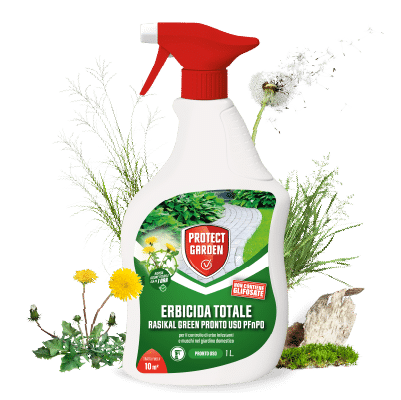 Rasikal Green PFnPO è un erbicida totale a base di acido pelargonico, sostanza di origine naturale, efficace contro malerbe e muschi.