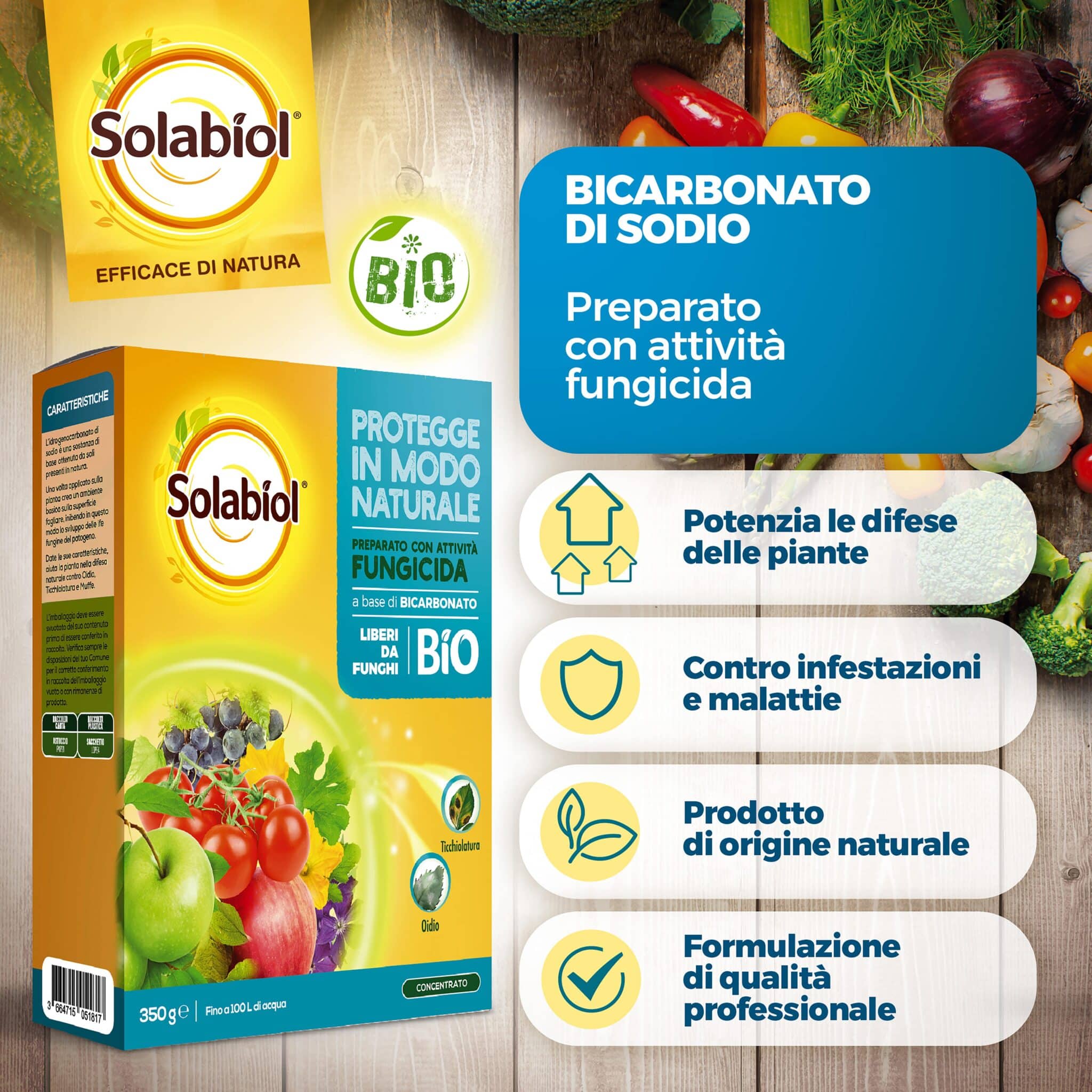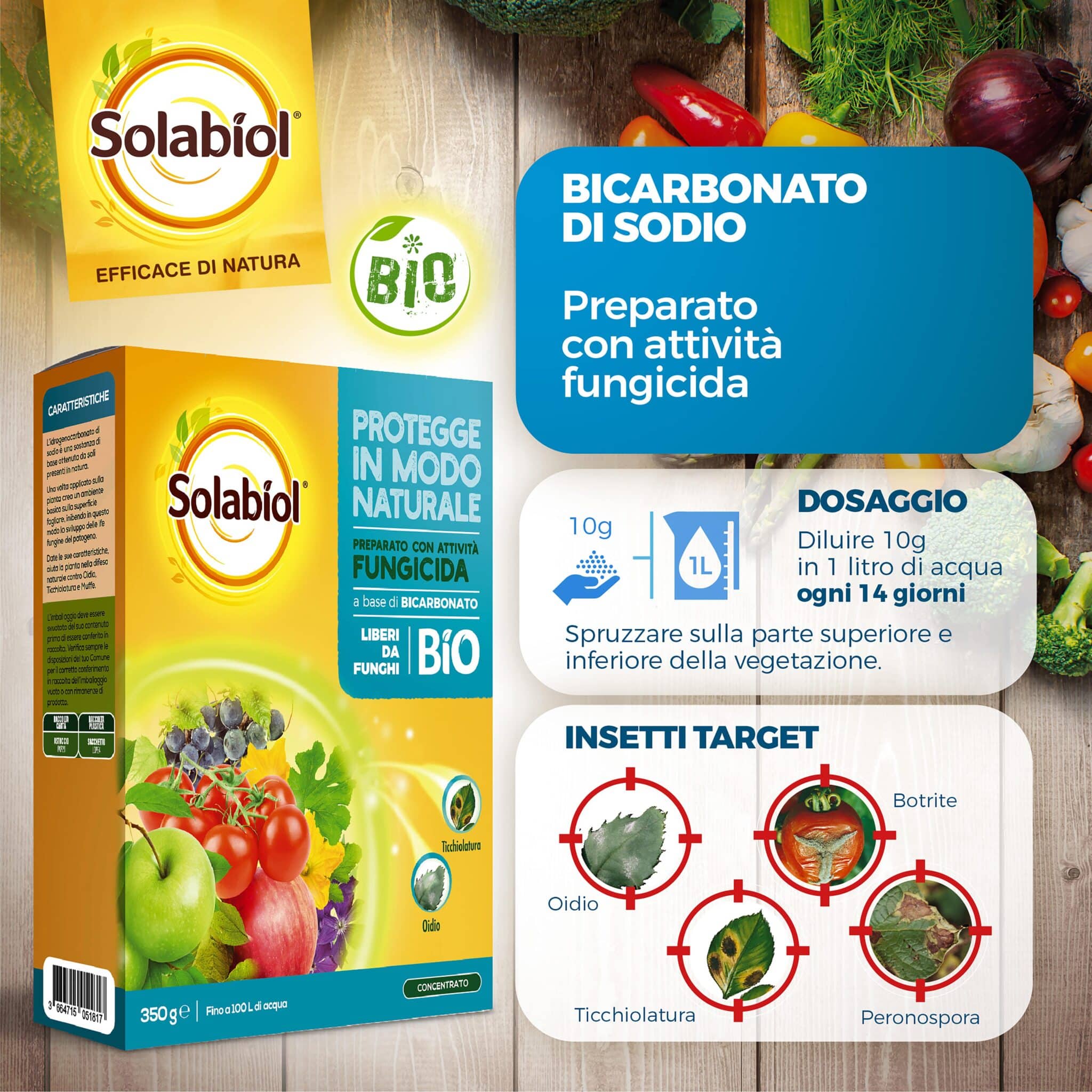 Il Bicarbonato di Sodio è un derivato dell’acido carbonico, nota sostanza alcalinizzante. Applicato sulle piante aiuta a migliorare e potenziare le loro difese naturali, in quanto permette di tamponare ed eliminare l’acidità degli essudati dei parassiti svolgendo un’ottima azione di aiuto per contrastare numerose malattie fungine come i marciumi radicali o del colletto e la ticchiolatura. È applicabile in frutticoltura, orticoltura e giardinaggio e può essere utilizzato in qualsiasi momento del ciclo produttivo.